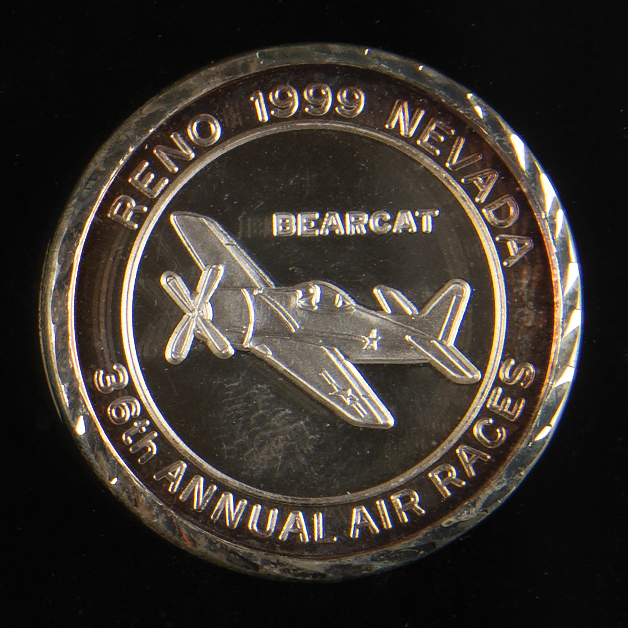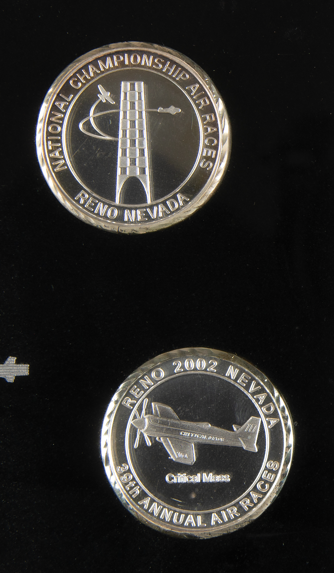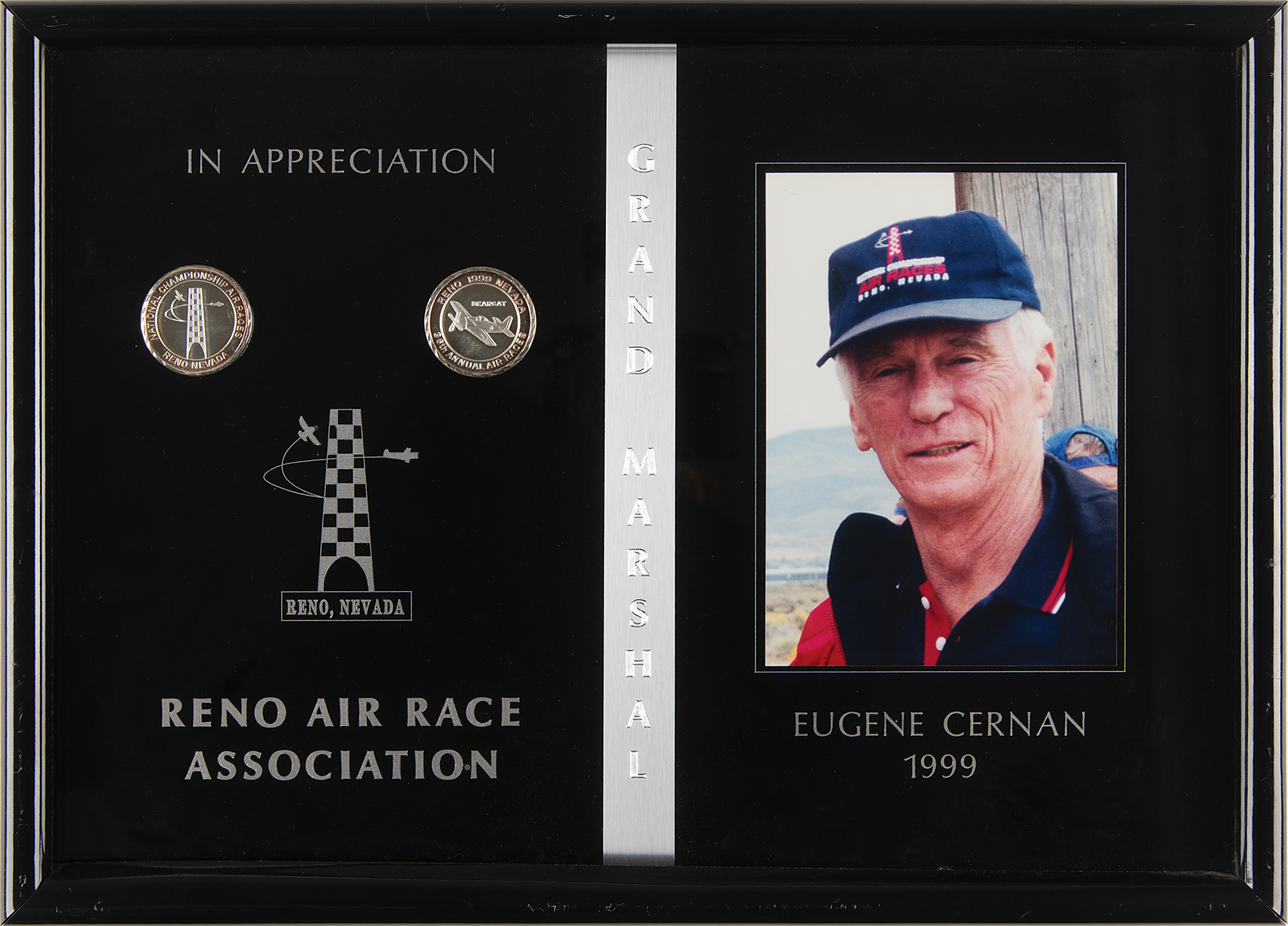 Gene Cernan’s pair of presentation displays issued to him by the Reno Air Race Association for his role in serving as ‘Grand Marshal’ at the legendary Reno Air Races of 1999, 2001, and 2002. Both framed displays measure 18 x 13 and contain color portraits of Cernan and commemorative medallions from the events: the 1999 display contains two medallions for the 36th Annual Air Race, and the display for the 2001 and 2002 events features four medallions for the 38th and 39th Annual Air Races. In overall fine condition.