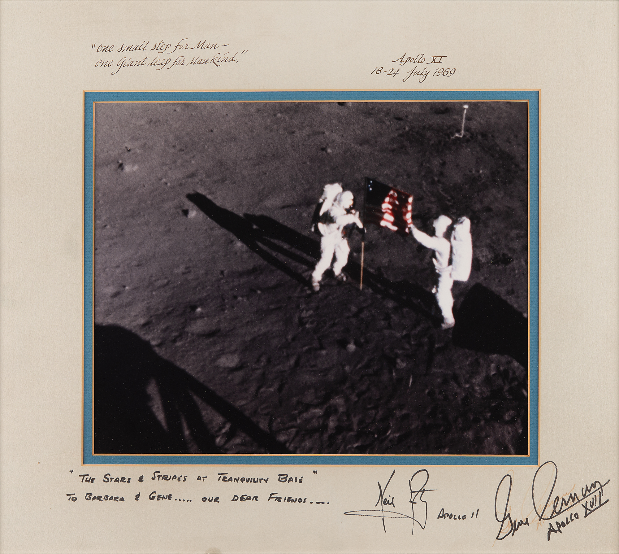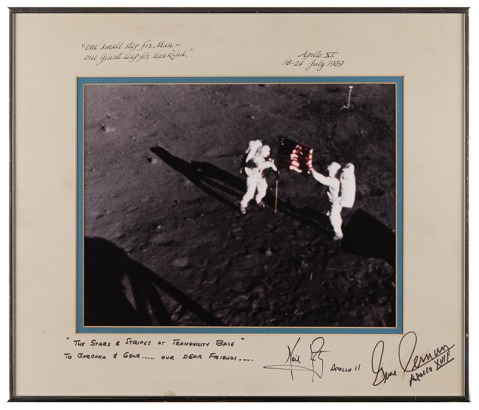 Beautiful official color glossy 13.25 x 10.25 NASA photograph of CDR Neil Armstrong and LMP Buzz Aldrin raising the American flag at the Sea of Tranquility lunar landing site during the Apollo 11 mission, signed and inscribed on the original presentation mat in black felt tip, “To Barbara & Gene… Our dear friends… Neil Armstrong, Apollo 11,” who adds a title to the image, “‘The Stars & Stripes at Tranquility Base.’” The right side is signed prominently in black felt tip by Gene Cernan, who adds “Apollo XVII,” and has signed over his initial attempt at a signature. The upper portion is calligraphically inscribed by another hand: “‘One small step for Man – one giant leap for Mankind.’ Apollo XI, 16-24 July 1969.” Framed to an overall size of 19.75 x 16.75. In fine condition, with a small stain to the bottom edge.