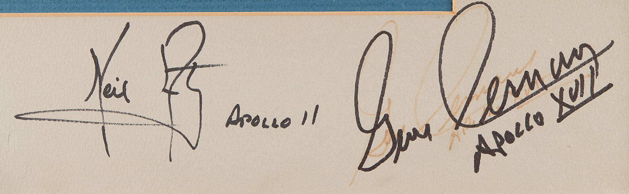 A marvelous union of the first and last men on the moon, which is further augmented by Neil Armstrong’s patriotic inscription and the rarity of the image itself — very few photos of CDR Armstrong on the moon exist, as he was the chief photographer during the Apollo 11 EVAs. Taken by the 16mm Data Acquisition Camera mounted inside the Lunar Module Eagle, this remarkable image is one of the iconic photographs of the 20th century, captured at the mission's triumphant climax when the stars and stripes were first unfurled on another celestial body.