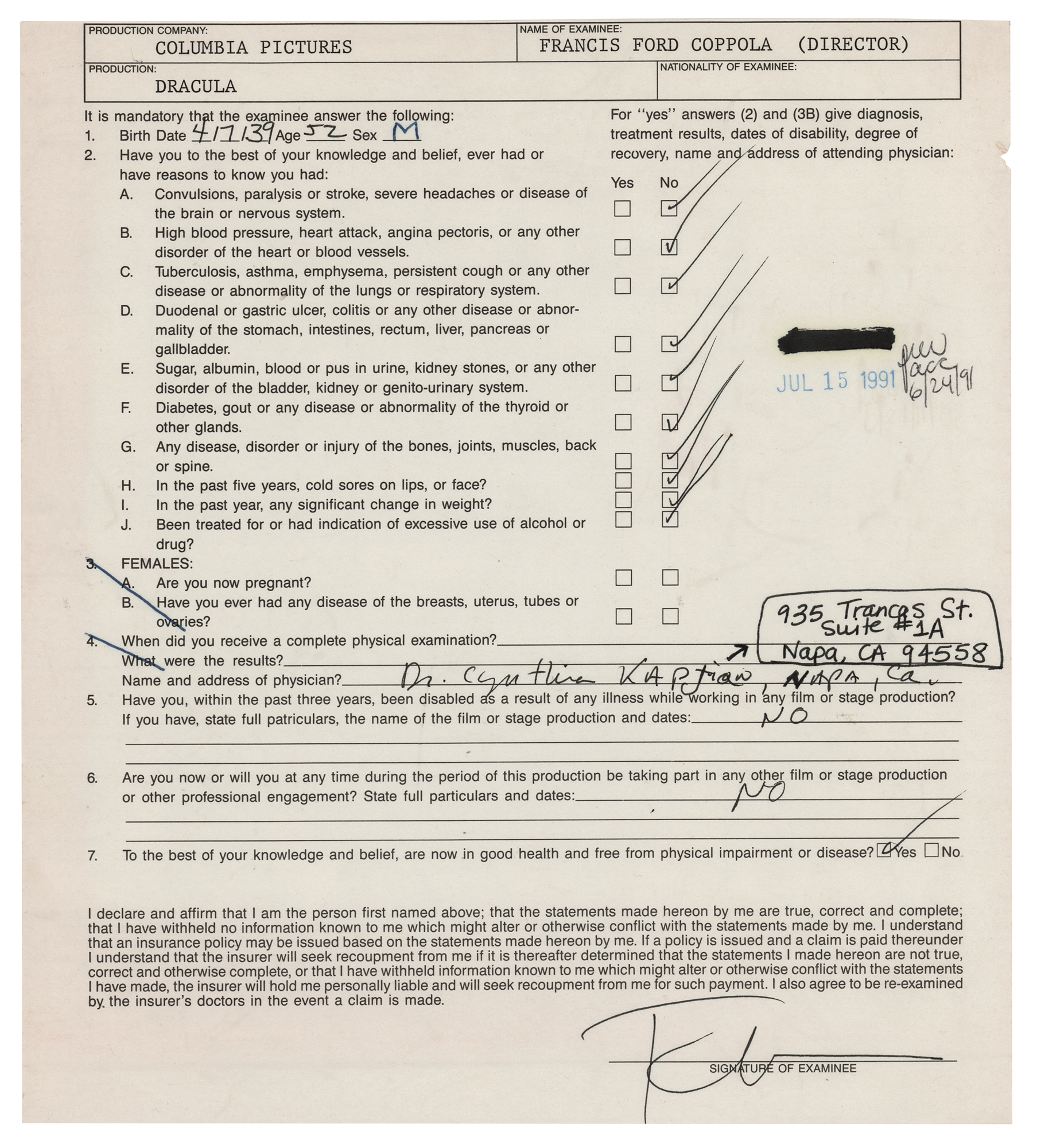DS, one page, 8.5 x 9.56, date-stamped June 15, 1991. Required medical questionnaire issued by Columbia Pictures before production of Coppola’s 1992 film Bram Stoker's Dracula, which the director has marked and annotated in black ink with his birth date and the name of his physician and address. Coppola checks all of the “NO” boxes for any health problems, writes “No” to two questions below, and ticks the “YES” box affirming that he is in good health. Signed at the conclusion by Coppola. In fine condition.