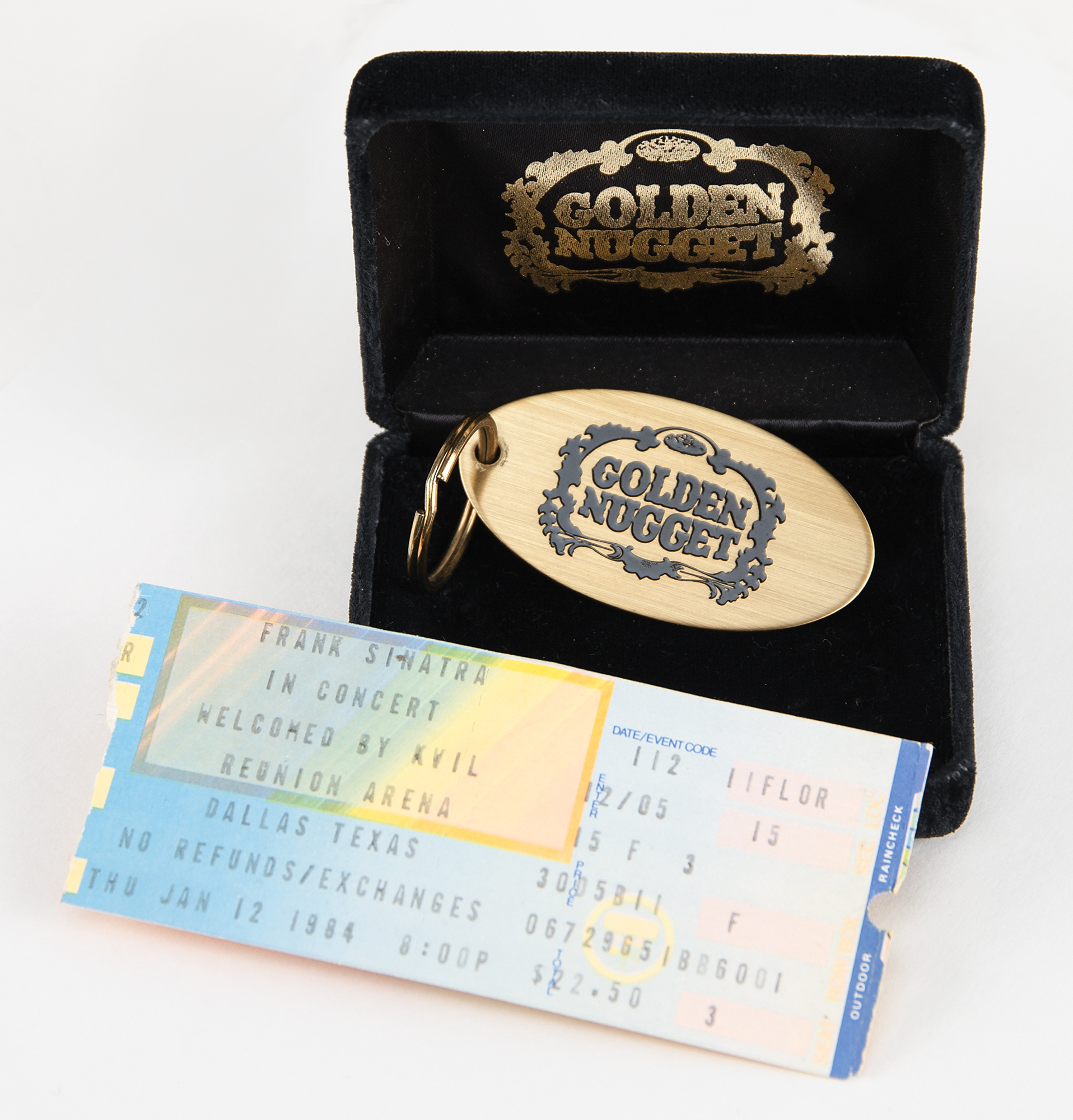 Swing Along with Me album by Frank Sinatra, who has signed the front cover in black felt tip. Handsomely matted and framed to an overall size of 17 x 17. In fine condition. The consignor notes that the signature was obtained at a special in-person VIP event at the Golden Nugget in Dallas, Texas, in August 1983. Accompanied by a commemorative keychain from the event with its original case, and a ticket stub for a Frank Sinatra concert at Dallas’ Reunion Arena on January 12, 1984.