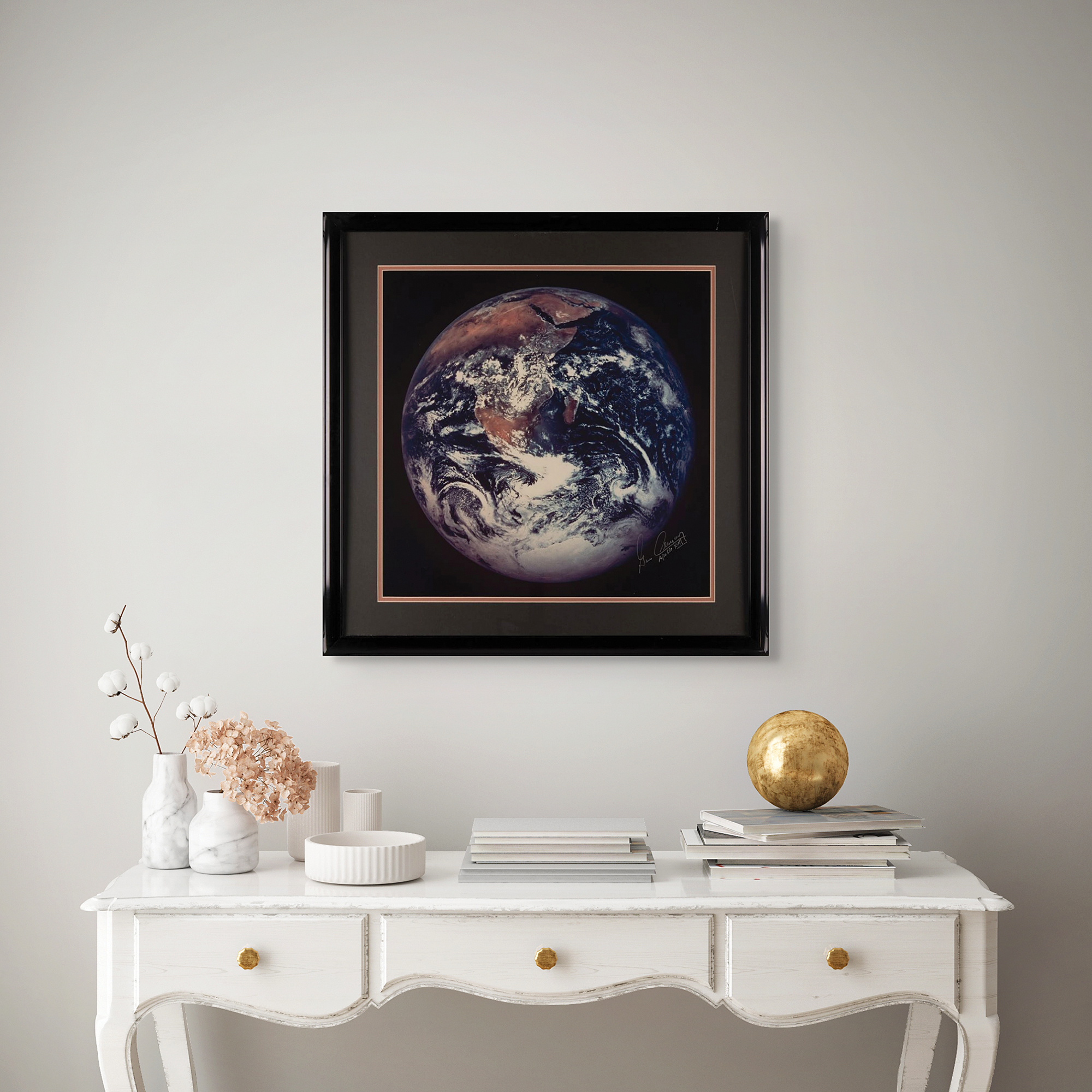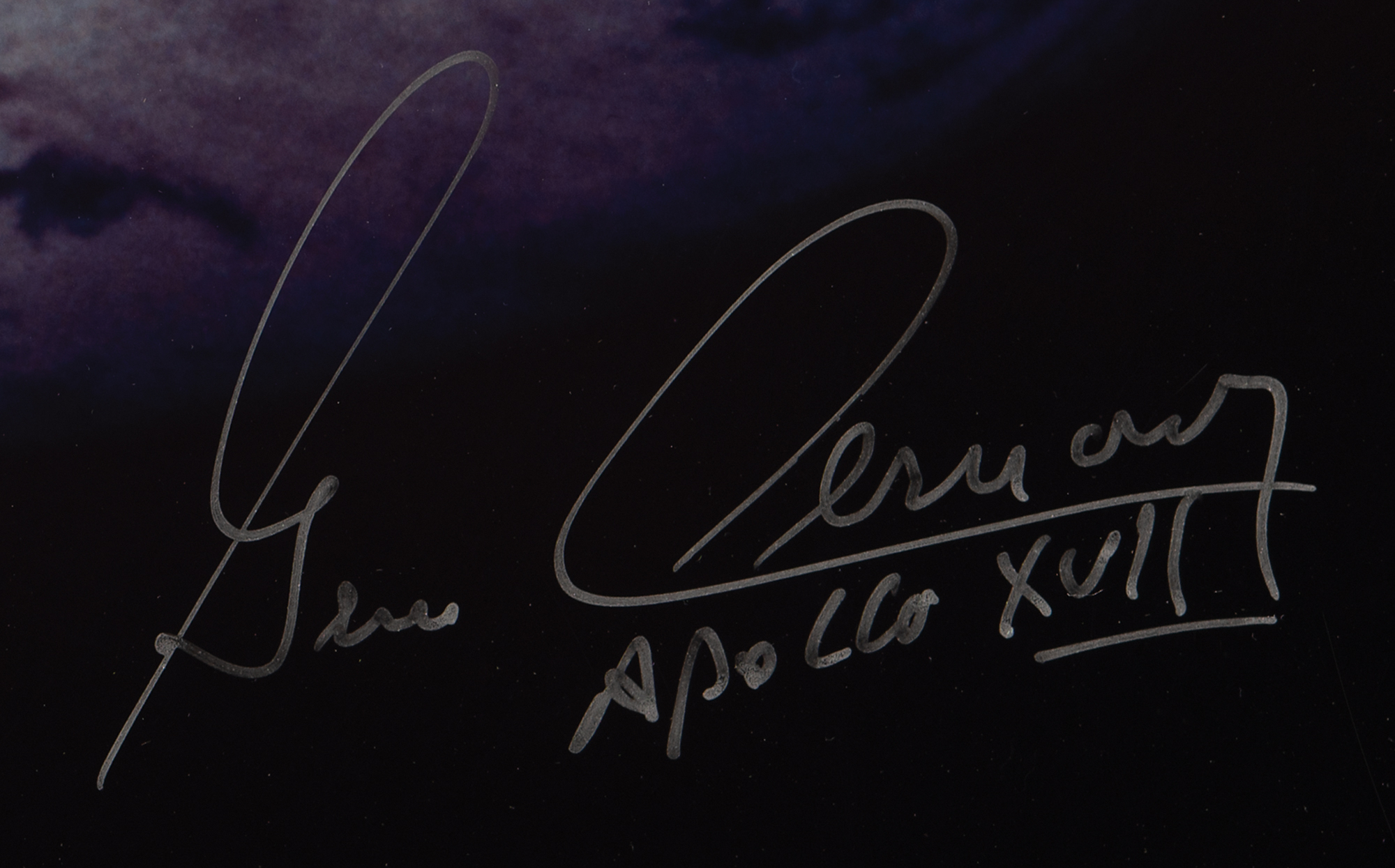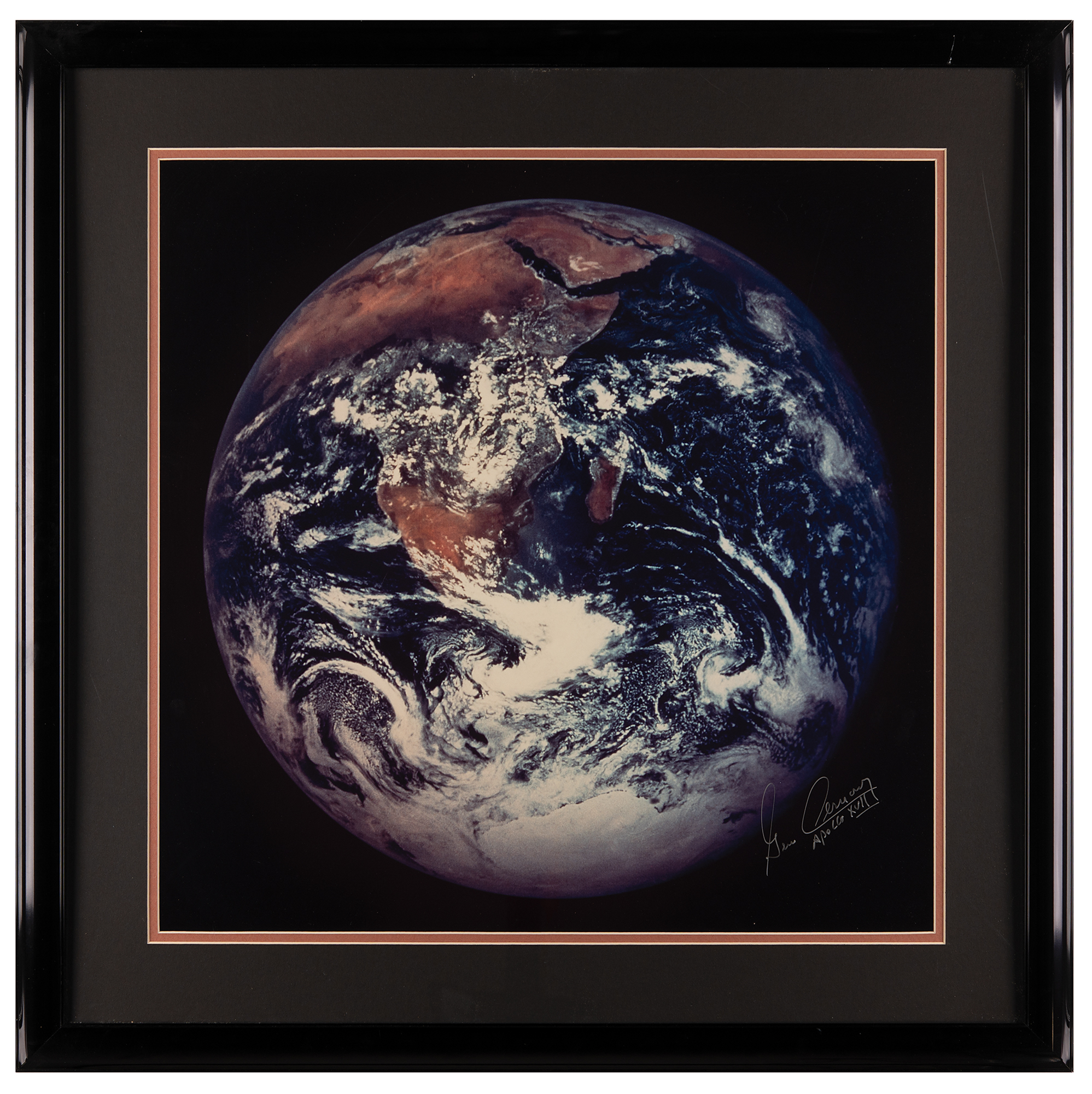 Gorgeous color glossy 19.5 x 19.5 photo of planet Earth as viewed from outer space, signed in silver ink, “Gene Cernan, Apollo XVII.” Double-matted and framed to an overall size of 26.5 x 26.5. In very fine condition. Accompanied by its original cardboard box (the photograph’s listed COA is not present).