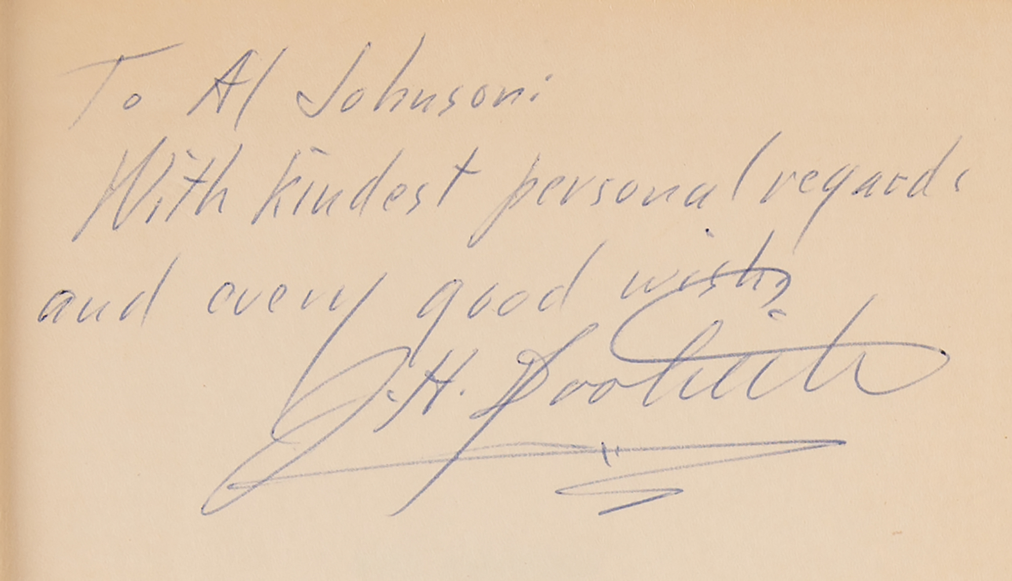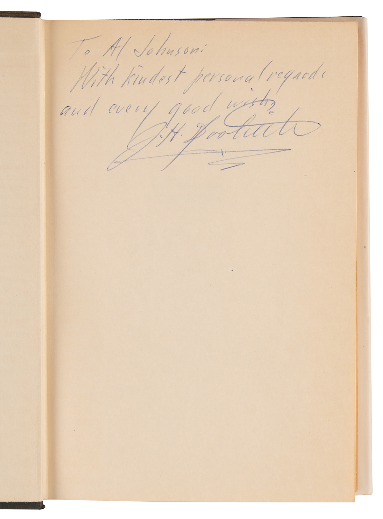 Signed book: The Amazing Mr. Doolittle. Later printing. NY: Appleton-Century-Crofts, Inc., 1953. Hardcover with dust jacket, 5.75 x 8.25, 313 pages. Signed and inscribed on the first free end page in blue ballpoint, "To Al Johnson: With kindest personal regards and every good wish, J. H. Doolittle." In fine condition, with clipped dust jacket flaps.