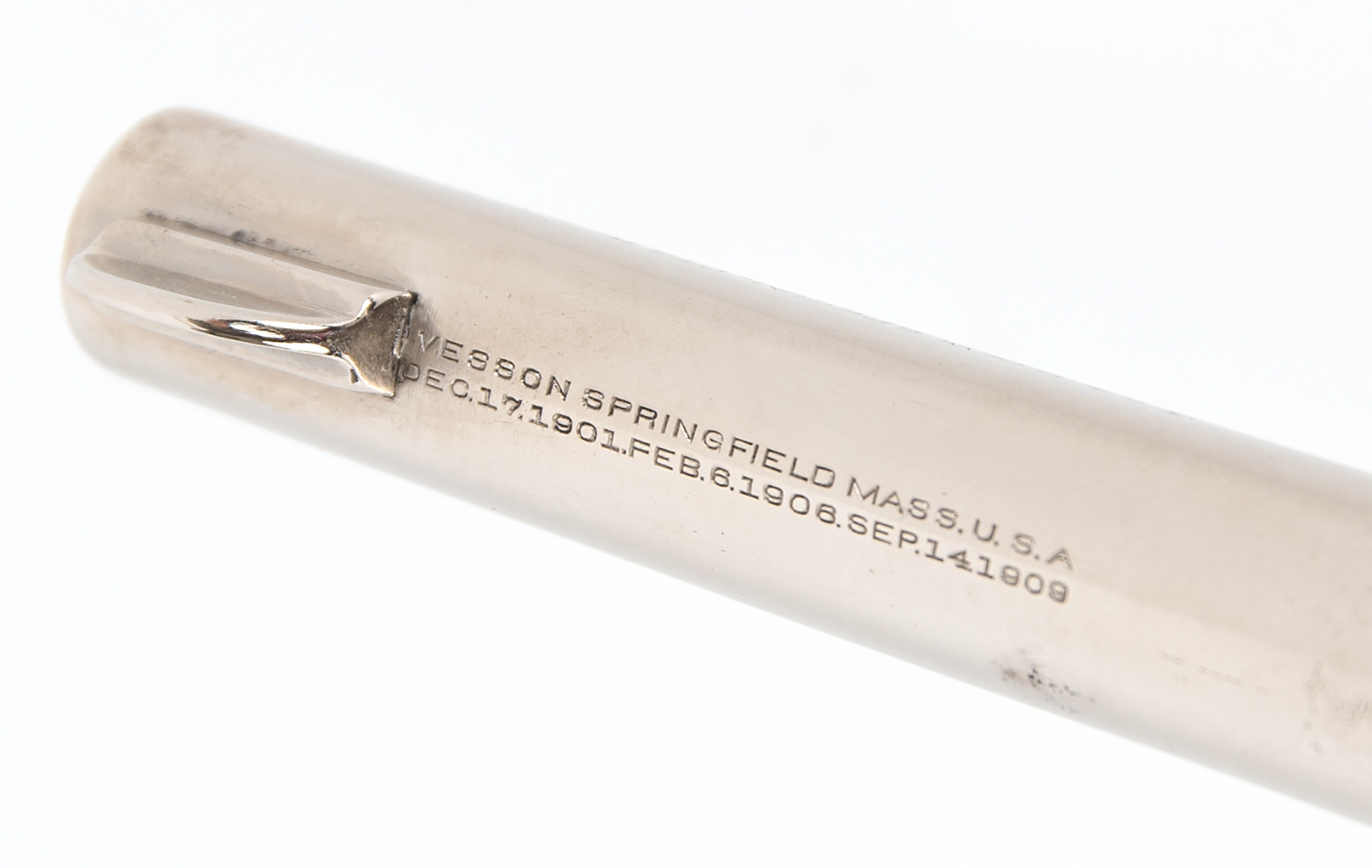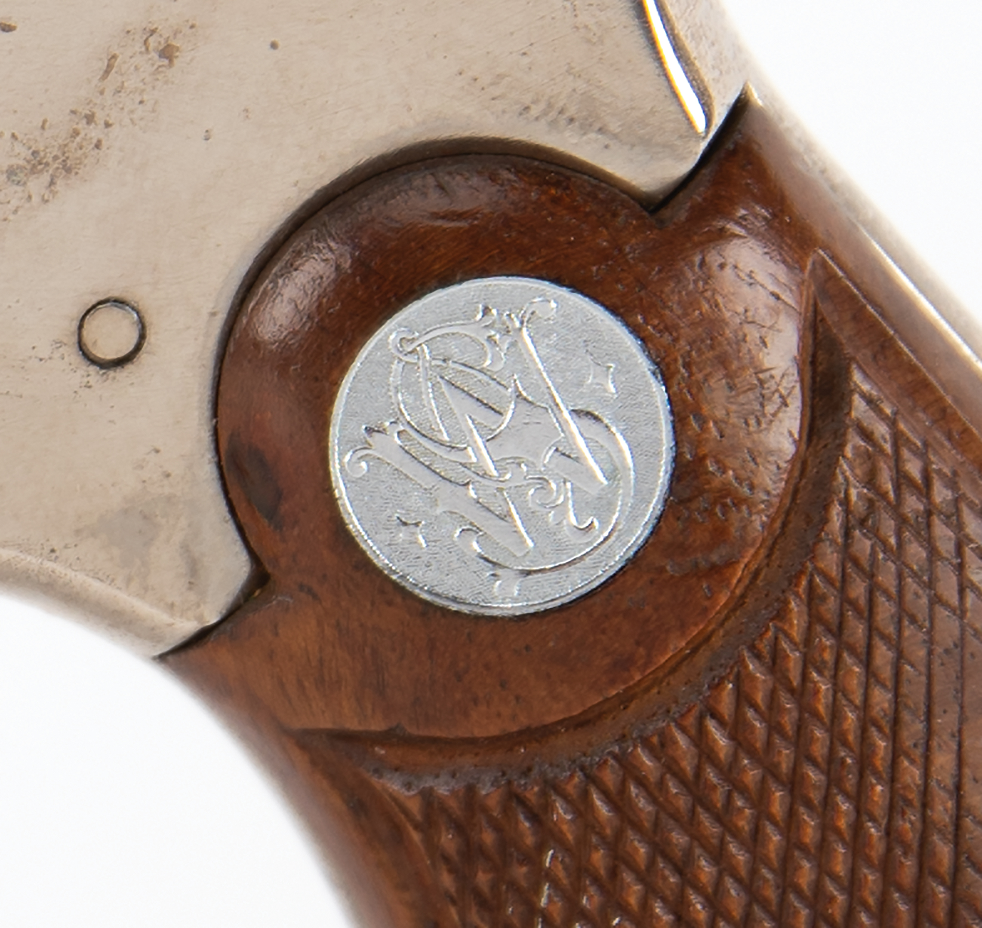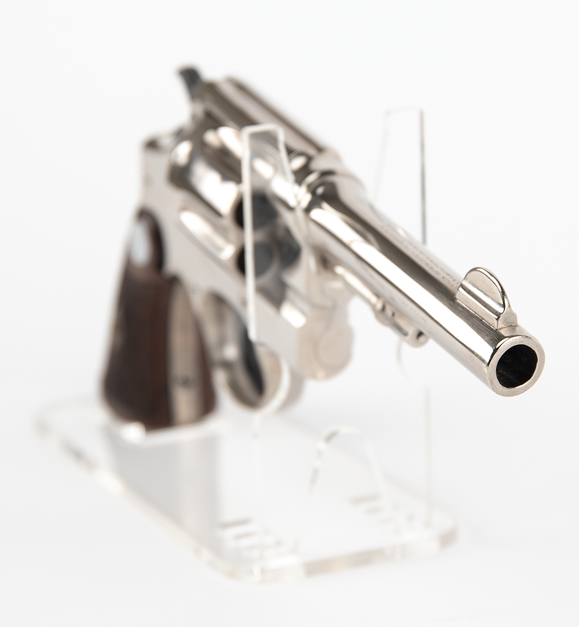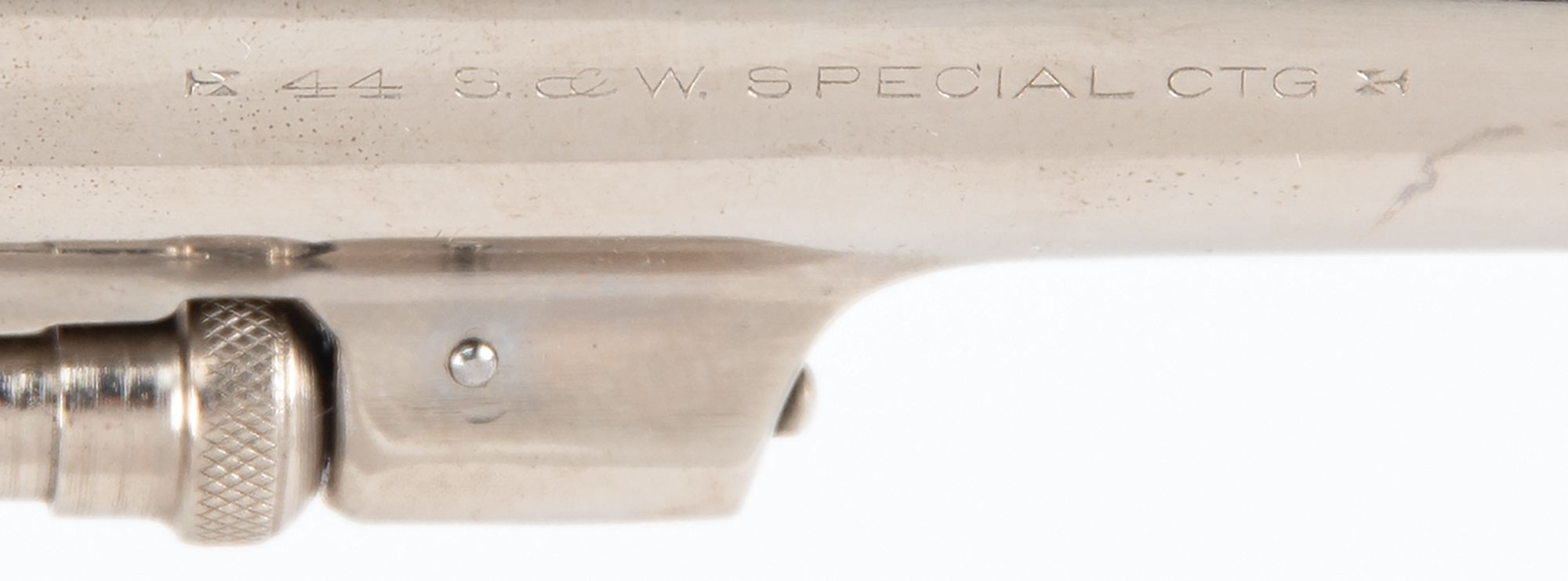 Accompanied by a Smith and Wesson factory letter stating that this revolver, serial number 18110, was shipped with a 6.5-inch barrel and a nickel finish on January 25, 1922, to Richards-Conover Hardware Co., Kansas City, Missouri. As recovered from the car the revolver had a barrel that was shortened to 4 7/8 inches with the original front sight professionally installed and the factory butt swivel removed. While in the possession of the Barnette and Henry families the revolver developed several areas of rust; the Henry brothers therefore had the revolver professionally restored by one of the best gunsmiths in the country, David R. Chicoine of North Carolina, in 2003. It now has 100% nickel remaining with a very good bore, tight action, and factory checkered walnut grips that show wear along the backstrap where they have had the checkering scraped to thin the grip.