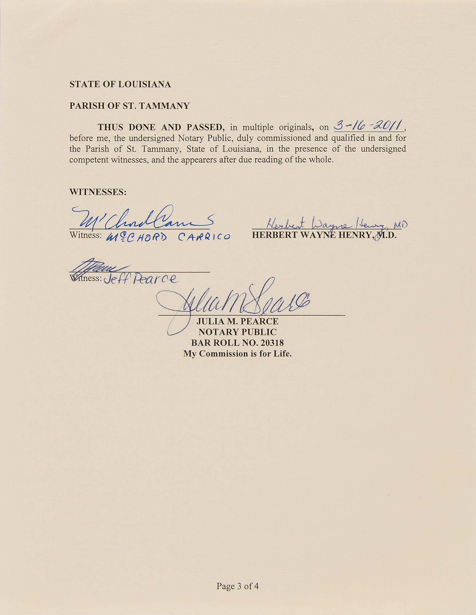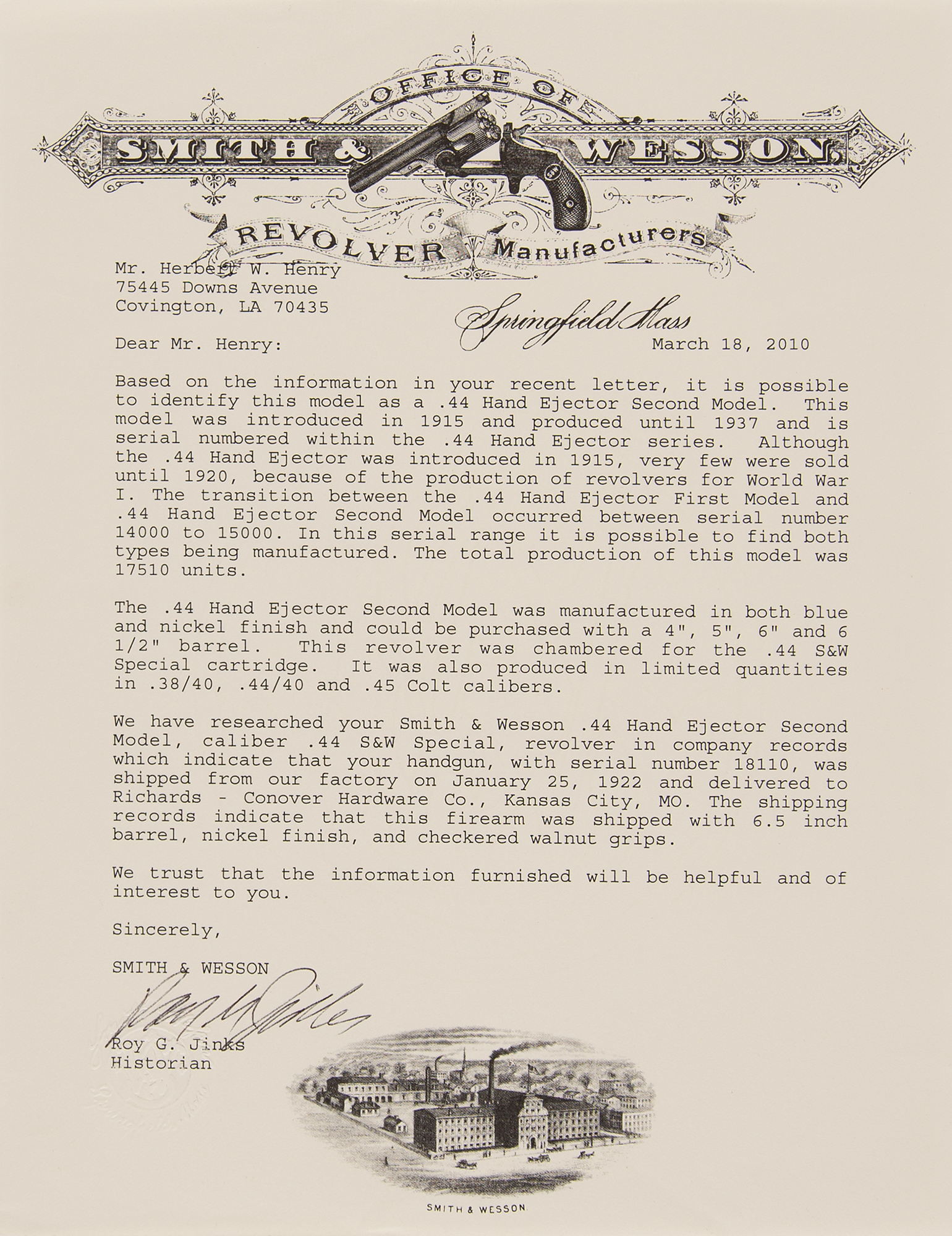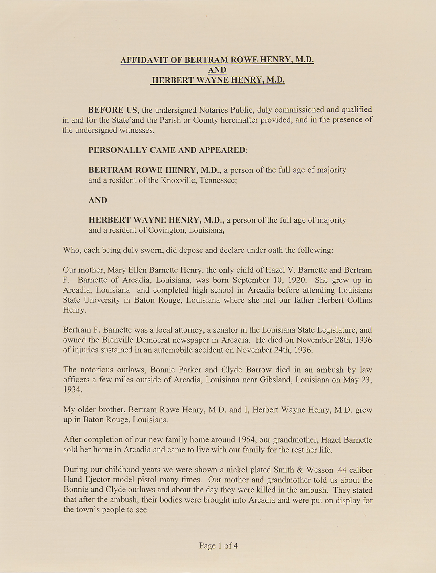 A Smith & Wesson .44 caliber revolver taken from the Bonnie and Clyde ambush vehicle—this Second Model Hand Ejector revolver, serial #18110, was given by Sheriff Henderson Jordan to his friend Bertram F. Barnette, a local attorney, senator in the Louisiana State Legislature, and owner of the Bienville Democrat newspaper. Included is a notarized affidavit from Bertram Rowe Henry, M.D., and Herbert Wayne Henry, M.D. (the grandsons of Bertram F. Barnette), relating that during their childhood years they were shown this Smith and Wesson revolver many times and that their mother and grandmother told them about the ambush of Bonnie and Clyde and how their bodies were put on display for the "town's people to see."