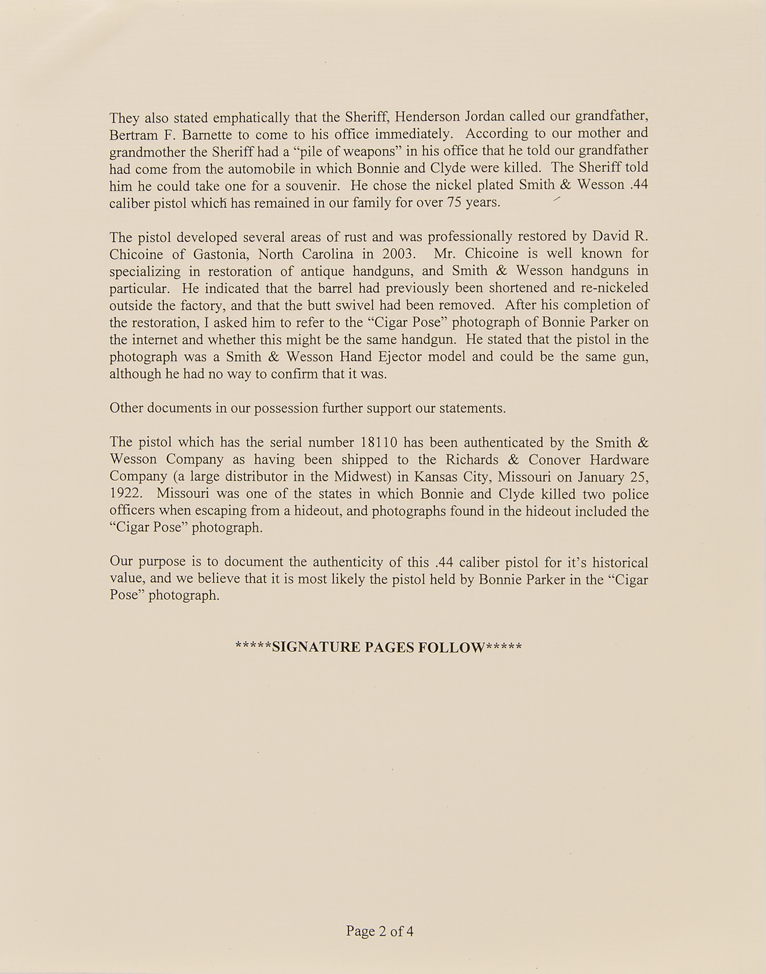 They also state that Sheriff Henderson Jordan had called for their grandfather to come to his office immediately, where he found a "pile of weapons" and was invited to take one for a souvenir: "He chose the nickel plated Smith and Wesson .44 caliber pistol which has remained in our family for over 75 years." Also included is a signed letter from Bertram F. Barnette's legal secretary at that time, Norma Duty, dated January 29, 1986, in which she states: "I saw Clyde and Bonnie at the funeral home but did not see a weapon of any kind and am reasonably sure Sheriff Jordan was telling the truth when he told your father the gun belonged to and was in the possession of Bonnie and Clyde." In photographs taken of the stockpile of weapons laid out on the sheriff's desk that day, there is a Smith and Wesson .44 caliber pistol clearly visible; the gun offered here is most likely that pistol.