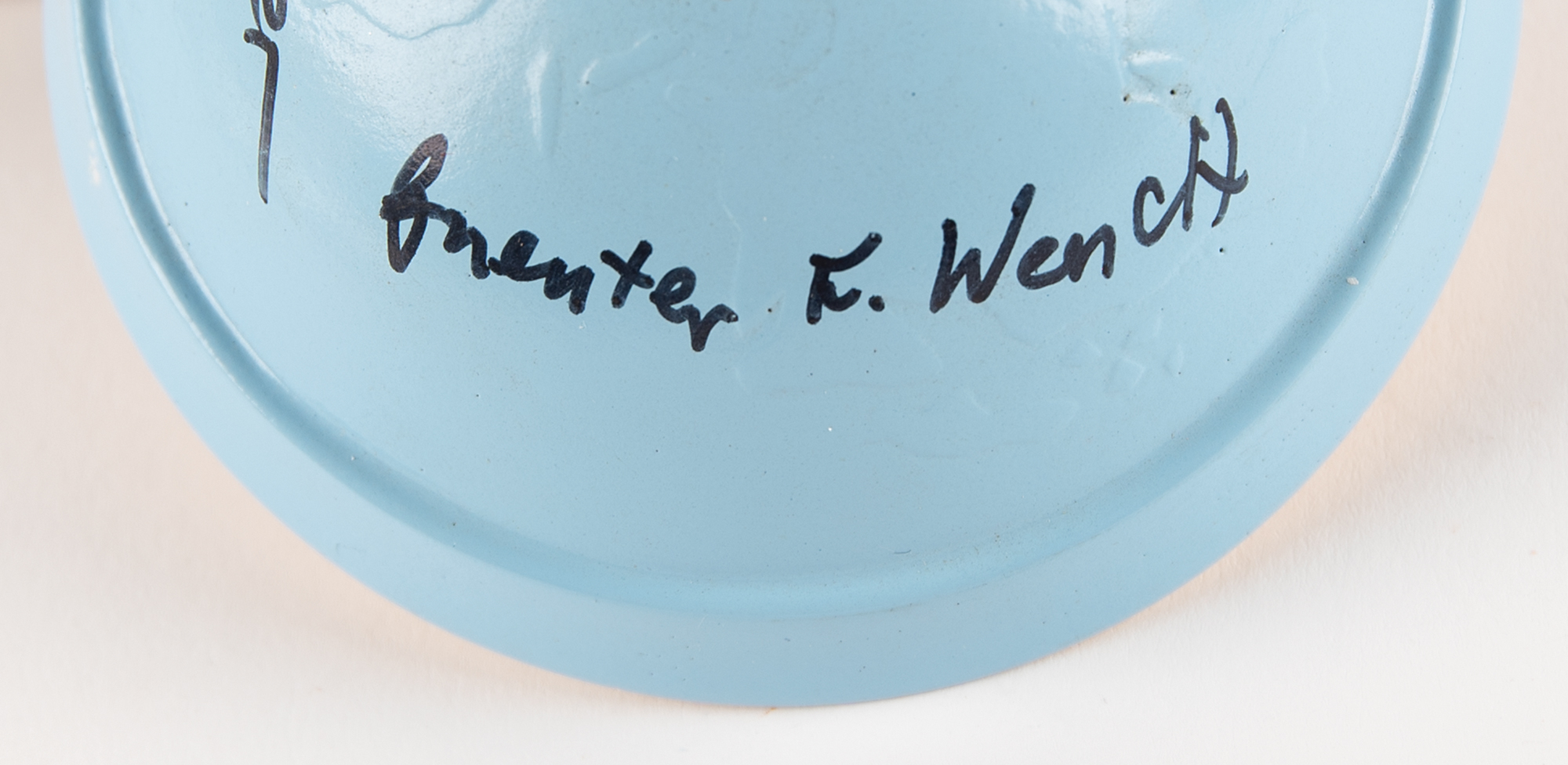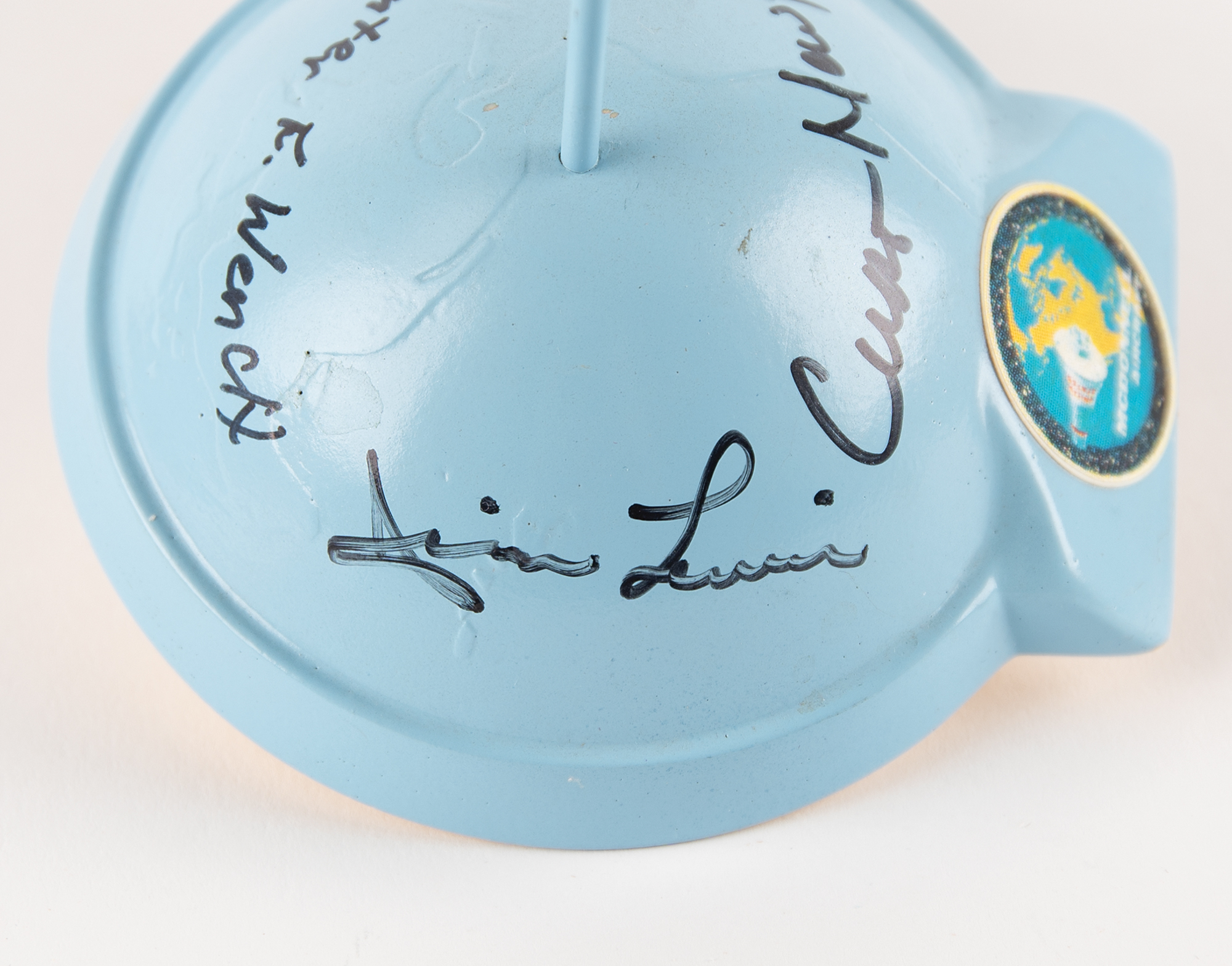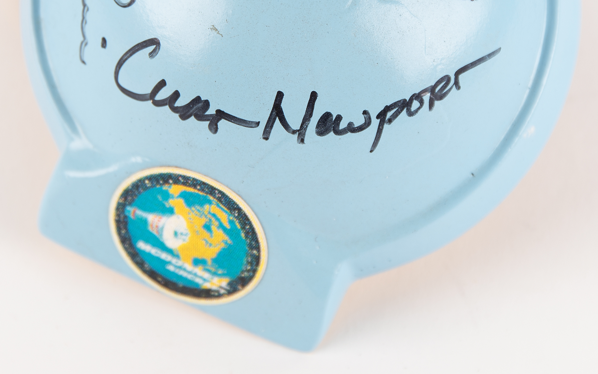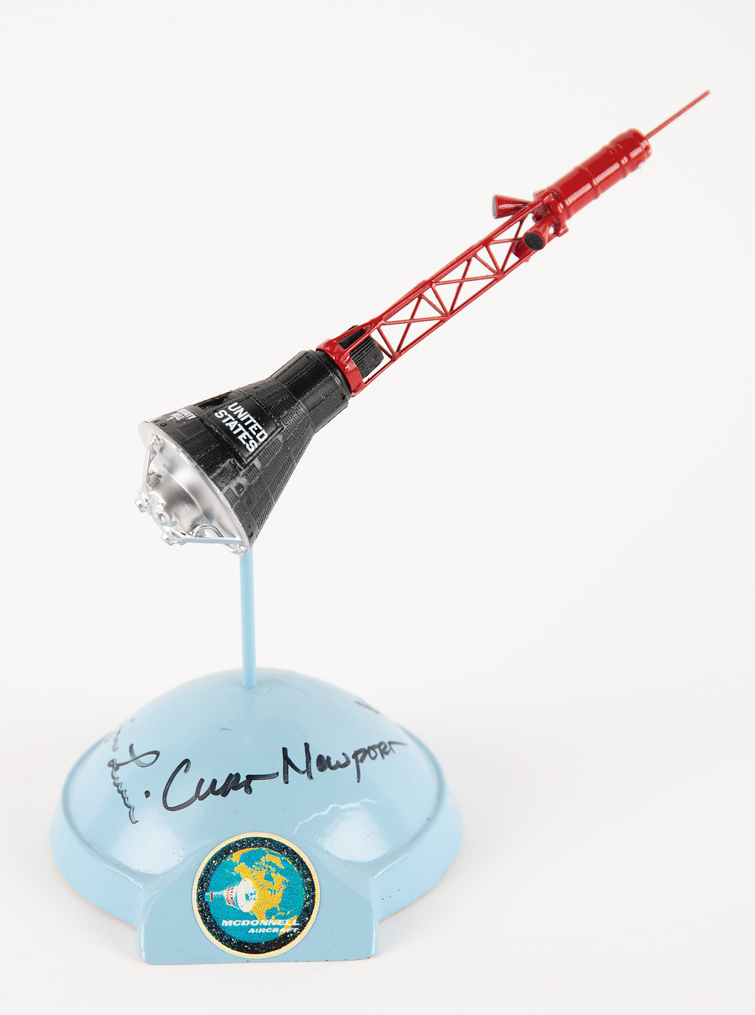 Attractive model of the Liberty Bell 7 with escape tower by Nick Proach Models, standing 6.5˝ in height and set upon a blue metal base, 4.25˝ x 3.75˝, with affixed McDonnell Aircraft logo; the base is signed in black felt tip by Curt Newport, the Liberty Bell 7 recovery expedition leader, Jim Lewis, the helicopter pilot for attempted recovery of the spacecraft, and Guenter Wendt, famed pad leader for NASA crewed spacecraft and the last person to see Grissom before launch. All three were onboard Newport’s ship 'Ocean Project' when Liberty Bell was raised from a depth of more than 15,000 feet some 38 years after being lost. Includes a color satin-finish 10 x 8 photo of Gus Grissom’s capsule pictured on the ocean floor, signed in black felt tip by Newport, Lewis, and Wendt. In overall fine condition.