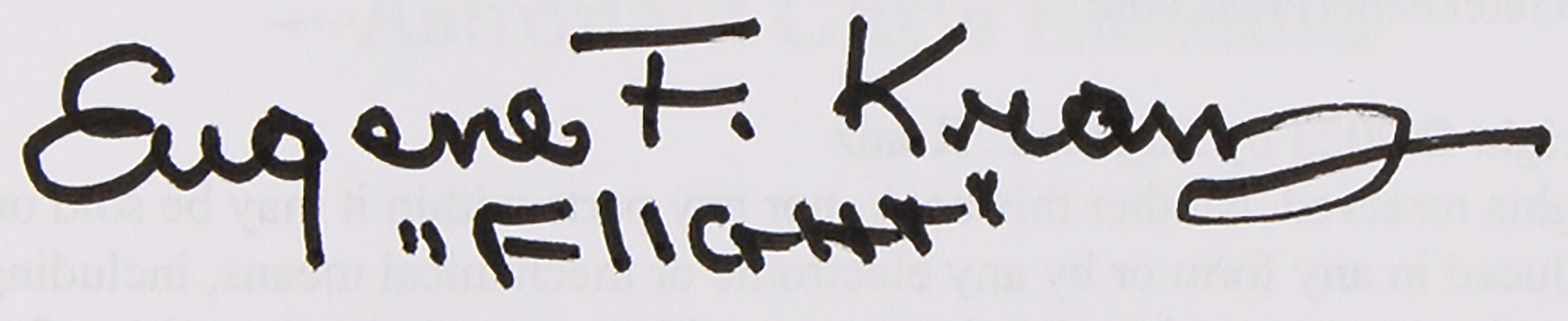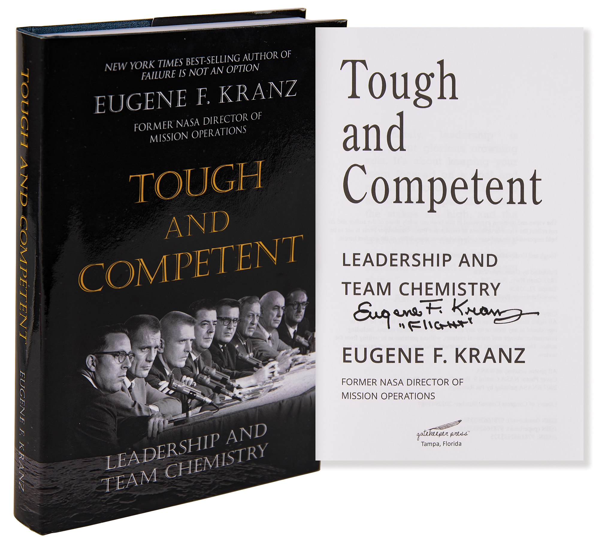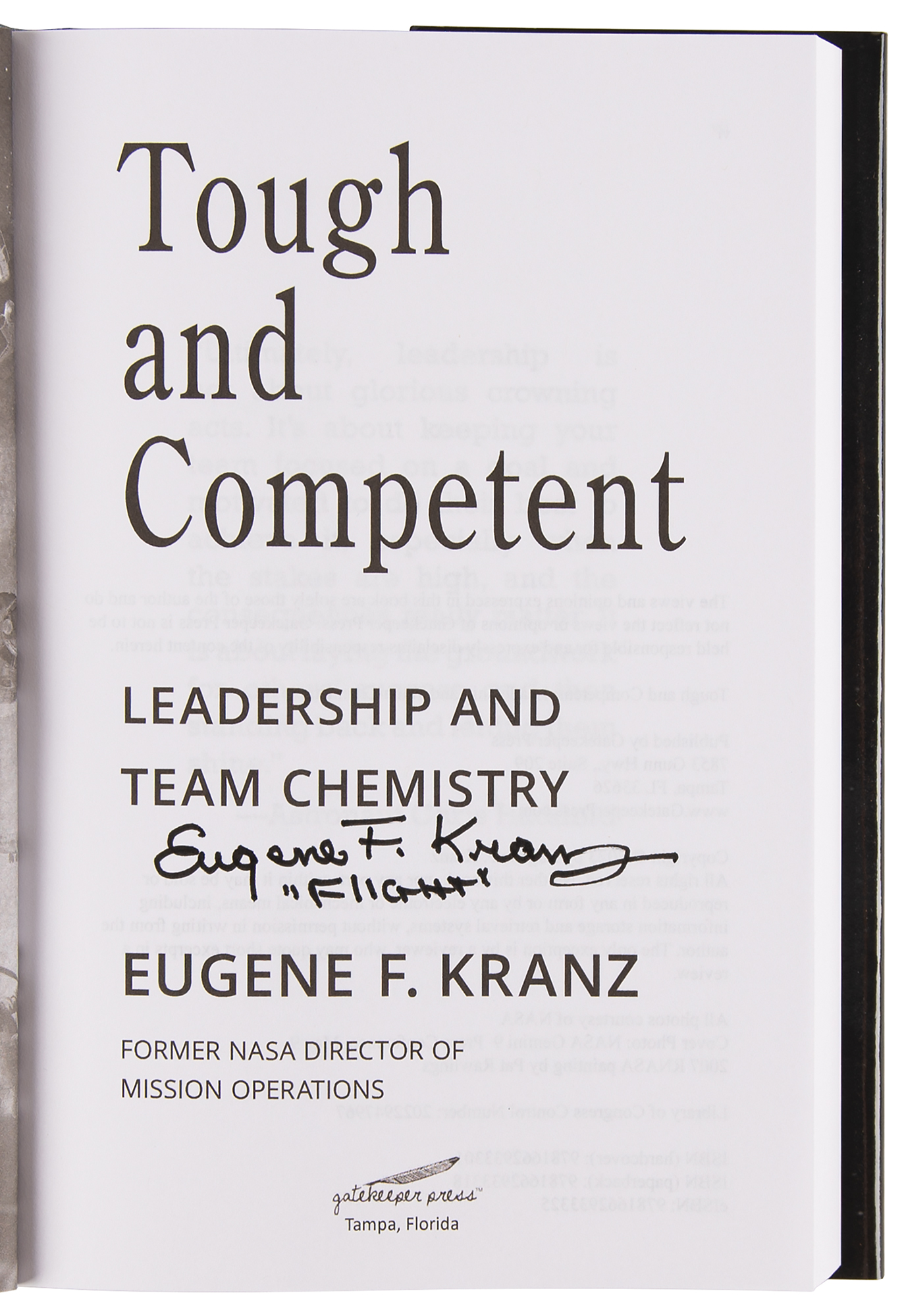 Signed book: Tough and Competent: Leadership and Team Chemistry. First edition. Tampa, FL: Gatekeeper Press, 2023. Hardcover with dust jacket, 6.25 x 9.25, 402 pages. Signed on the title page in black felt tip, "Eugene F. Kranz, 'Flight.'" Kranz did very few public signings for this title making this a difficult example to find. In very fine condition.
