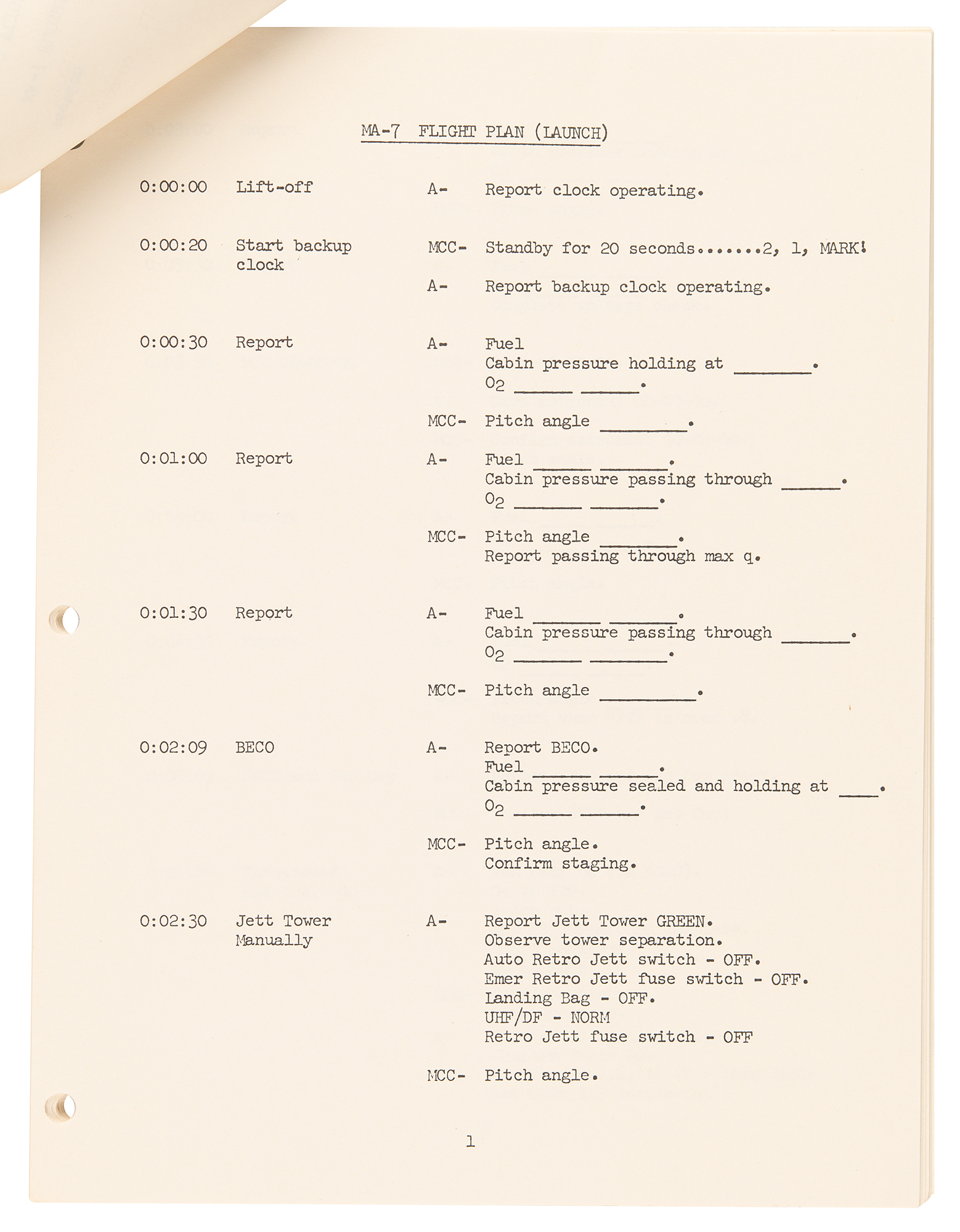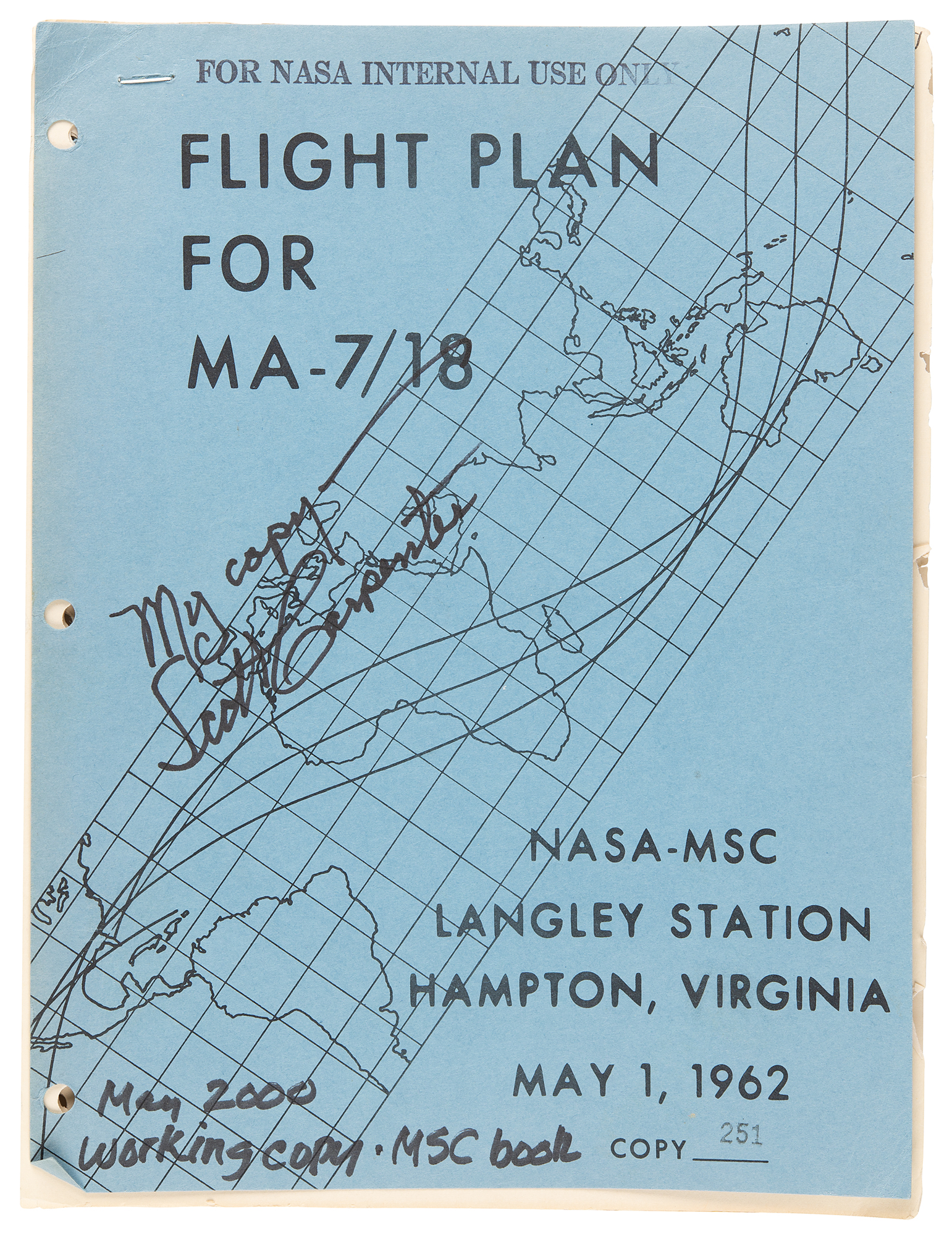 Scott Carpenter’s personally-owned and -used flight plan for the Mercury-Atlas 7 mission, the fourth crewed flight of Project Mercury, which cemented Carpenter as the sixth human to fly in space when he piloted his Aurora 7 spacecraft around the Earth three times on May 24, 1962. The stapled manual, 40 pages, 8 x 10.5, stamped “For NASA Internal Use Only” and entitled “Flight Plan for MA-7/18, NASA-MSC, Langley Station, Hampton, Virginia, May 1, 1962,” is signed on the front cover in black felt tip, “My copy – Scott Carpenter.” Issued as “Copy 251.” the manual consists of four main ‘MA-7 Flight Plan’ sections — Launch Phase, First Orbit, Second Orbit, and Third Orbit — and an additional 17 reference sections related to mission specifics like “Communications,” “Precision Attitude Hold,” “Balloon Experiment,” “Star Observation and Haze Layer Check,” “Photographs,” and more.