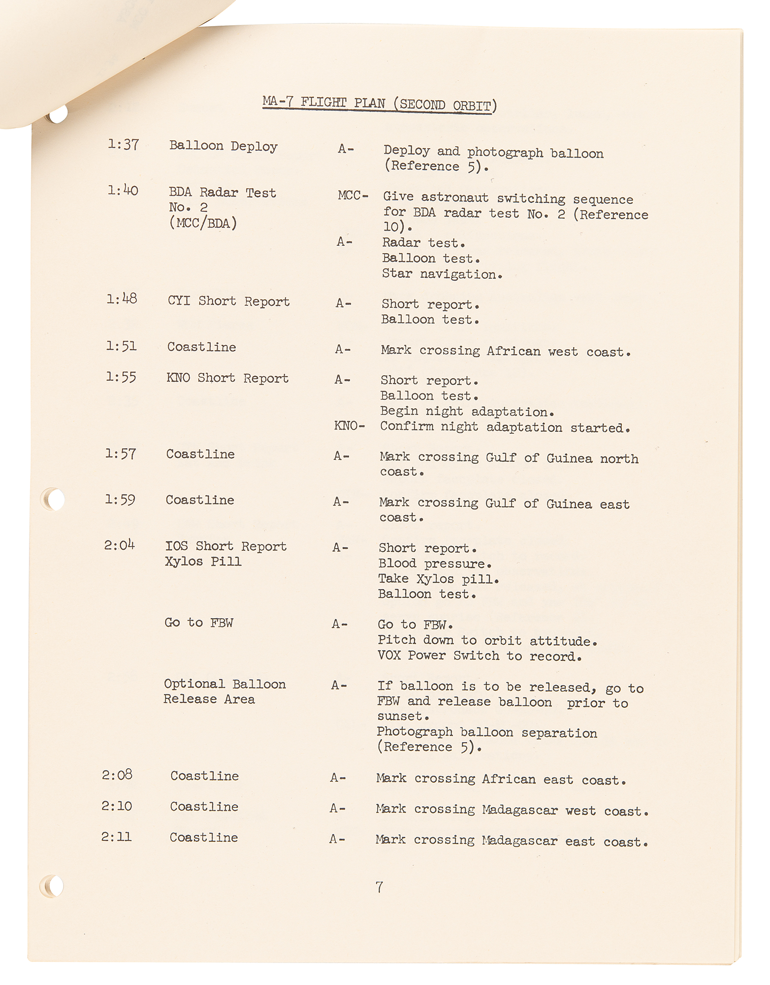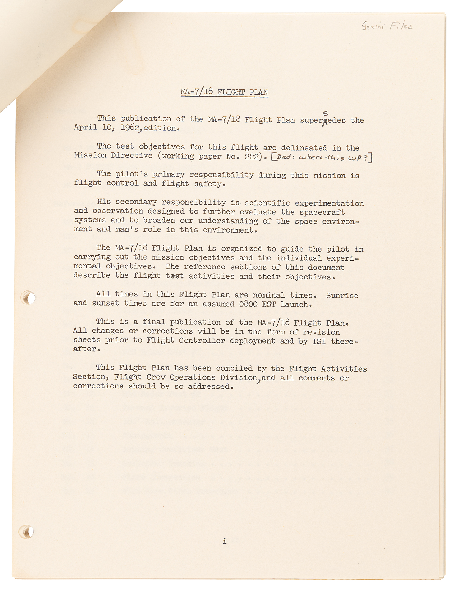 The manual’s preface reads, in part: “The pilot's primary responsibility during this mission is flight control and flight safety. His secondary responsibility is scientific experimentation and observation designed to further evaluate the spacecraft systems and to broaden our understanding of the space environment and man's role in this environment. The MA-7/18 Flight Plan is organized to guide the pilot in carrying out the mission objectives and the individual experimental objectives. The reference sections of this document describe the flight test activities and their objectives…This is a final publication of the MA-7/18 Flight Plan.” The manual bears a few handwritten notations, and the front cover is marked in an unknown hand: “May 2000, Working copy, MSC book.” In fine condition.