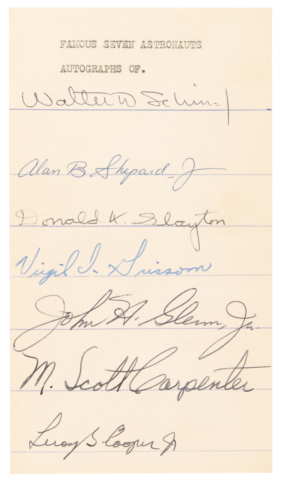 Wonderful ink and ballpoint signatures of the original Mercury 7 astronauts — “Walter M. Schirra, Jr.,” “Alan B. Shepard, Jr.,” “Donald K. Slayton,” “Virgil I. Grissom,” “John H. Glenn, Jr.,” “M. Scott Carpenter,” and “Leroy G. Cooper, Jr.” — on an off-white 3.5 x 6.25 card with upper typed caption. In very fine condition.