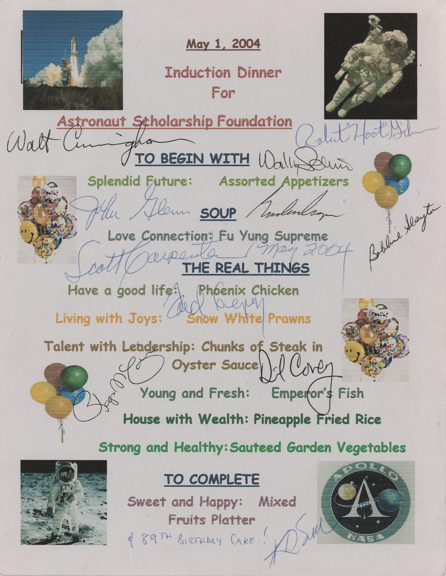 Printed color menu for an “Induction Dinner for the Astronaut Scholarship Foundation” on May 1, 2004, 8.5 x 11, signed in blue and black ballpoint by nine notable astronauts, including Mercury astronauts John Glenn, Wally Schirra, Gordon Cooper, and Scott Carpenter, Apollo 7 astronaut Walt Cunningham, and Space Shuttle astronauts Robert ‘Hoot’ Gibson, Kathryn Sullivan, Fred Gregory, and Dick Covey. The menu is also signed by Deke Slayton’s widow, Bobbie Slayton, and, curiously, Roger McGuinn of The Byrds. In fine condition.