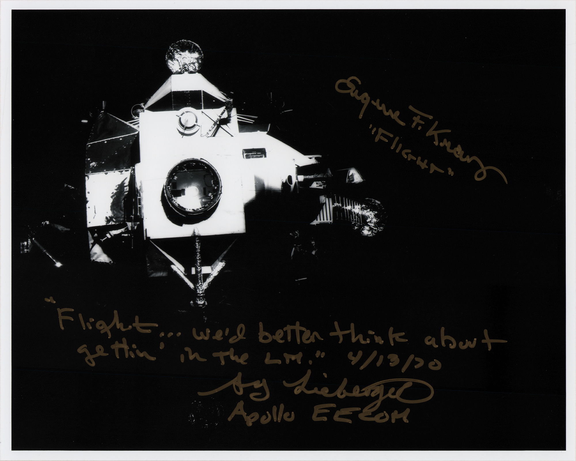 Choice satin-finish 10 x 8 photo of the Apollo 13 Lunar Module Aquarius, which served as the crew's 'lifeboat' following the explosion of a service module oxygen tank, signed in gold ink, "Eugene F. Kranz, 'Flight,'" and "'Flight… we'd better think about gettin' in the LM.' 4/13/70, Sy Liebergot, Apollo EECOM." In very fine condition.