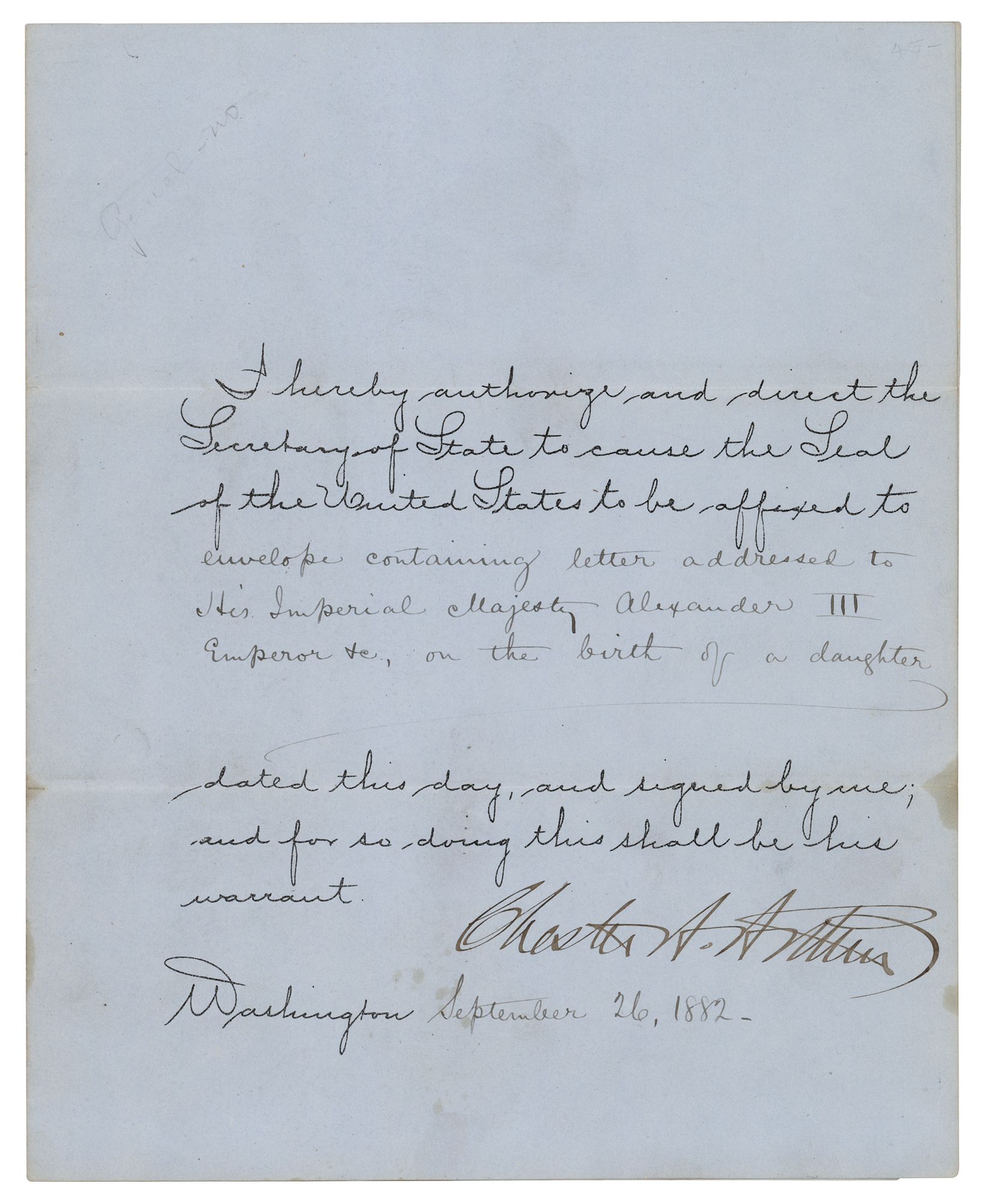 Partly-printed DS as president, one page, 8 x 10, September 26, 1882. President Arthur authorizes and directs the Secretary of State to cause the Seal of the United States to be affixed to an “envelope containing letter addressed to His Imperial Majesty Alexander III Emperor etc, on the birth of a daughter.” Signed prominently at the conclusion in ink by President Chester A. Arthur. In fine condition, with a few small stains.