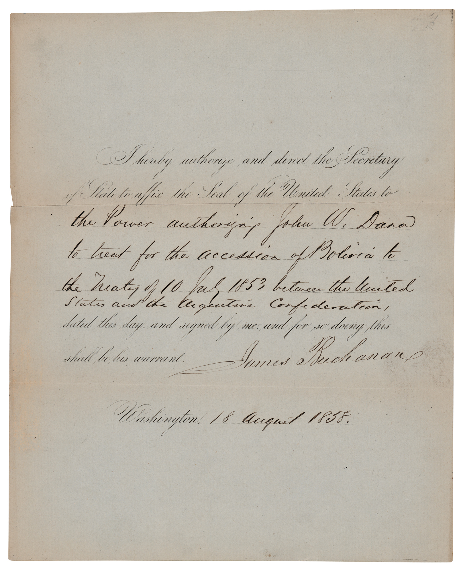 Partly-printed DS as president, one page, 8 x 10, August 18, 1858. President Buchanan directs the Secretary of State to affix the Seal of the United States to “the Power authorizing John W. Dana to treat for the accession of Bolivia to the Treaty of 10 July 1853 between the United States and the Argentine Confederation.” Signed neatly at the conclusion by James Buchanan. In fine condition, with faint toning to the edges and folds. John W. Dana was a businessman, diplomat, and Democratic politician in the U.S. state of Maine (1808–1867), who served as the 19th and 21st governor of Maine and as Chargé d'affaires to Bolivia during the 19th century.