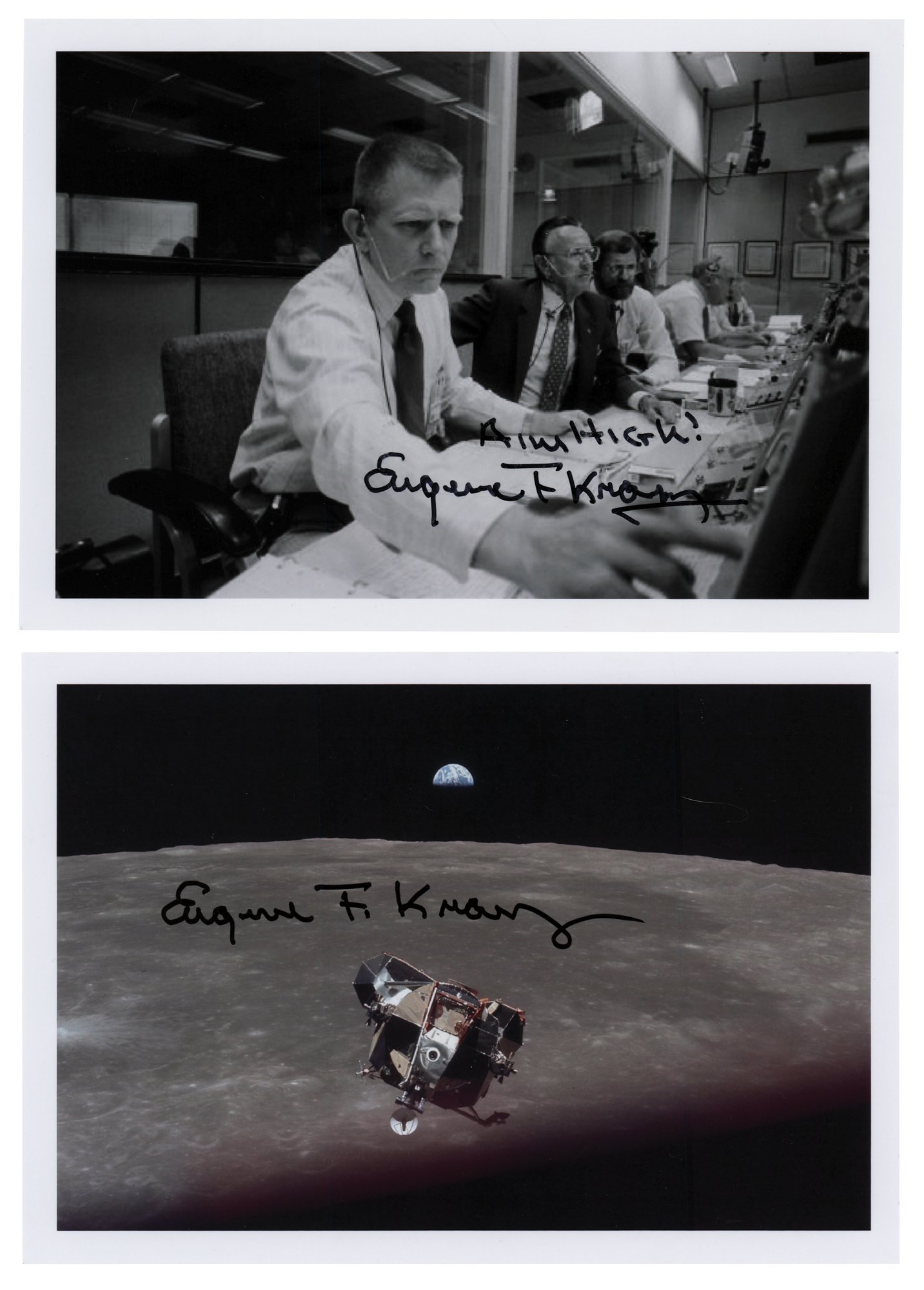 Two glossy 7 x 5 photos: one showing the Apollo 11 LM over the moon's surface, signed in black felt tip, "Eugene F. Kranz"; and one showing Kranz at his console in Mission Control, signed in black felt tip, "Aim High! Eugene F. Kranz." In overall very fine condition.