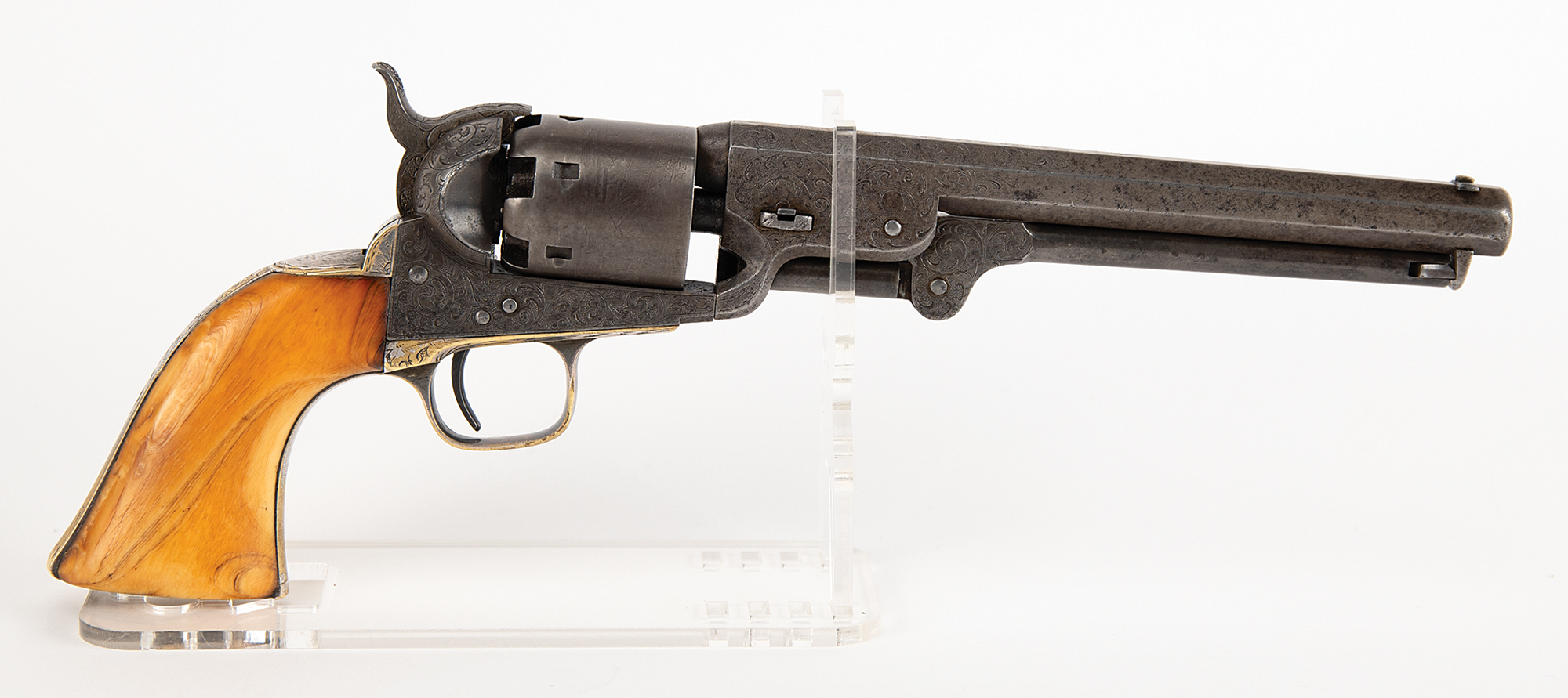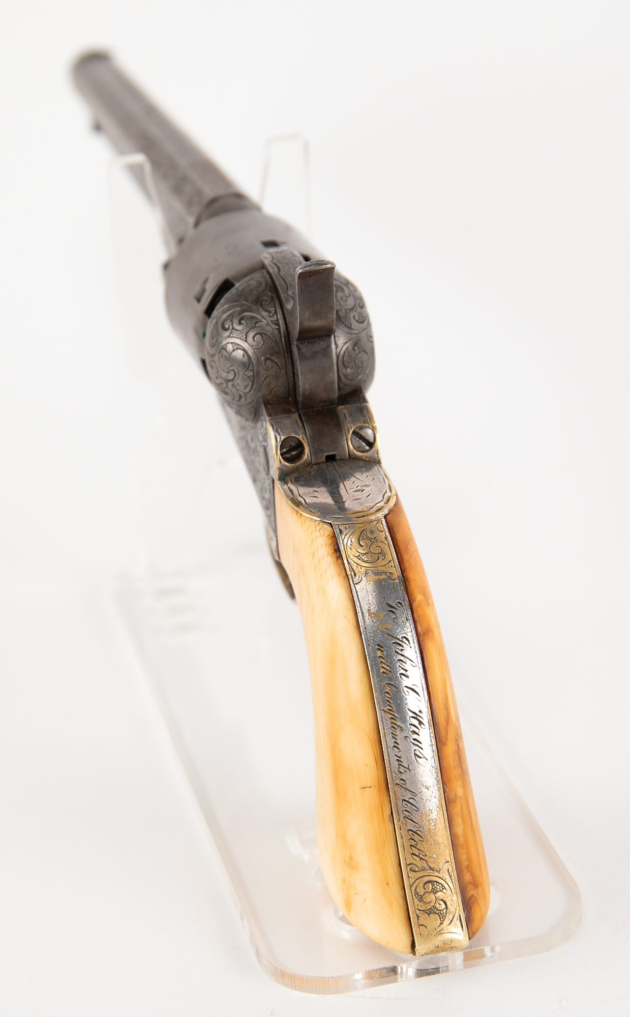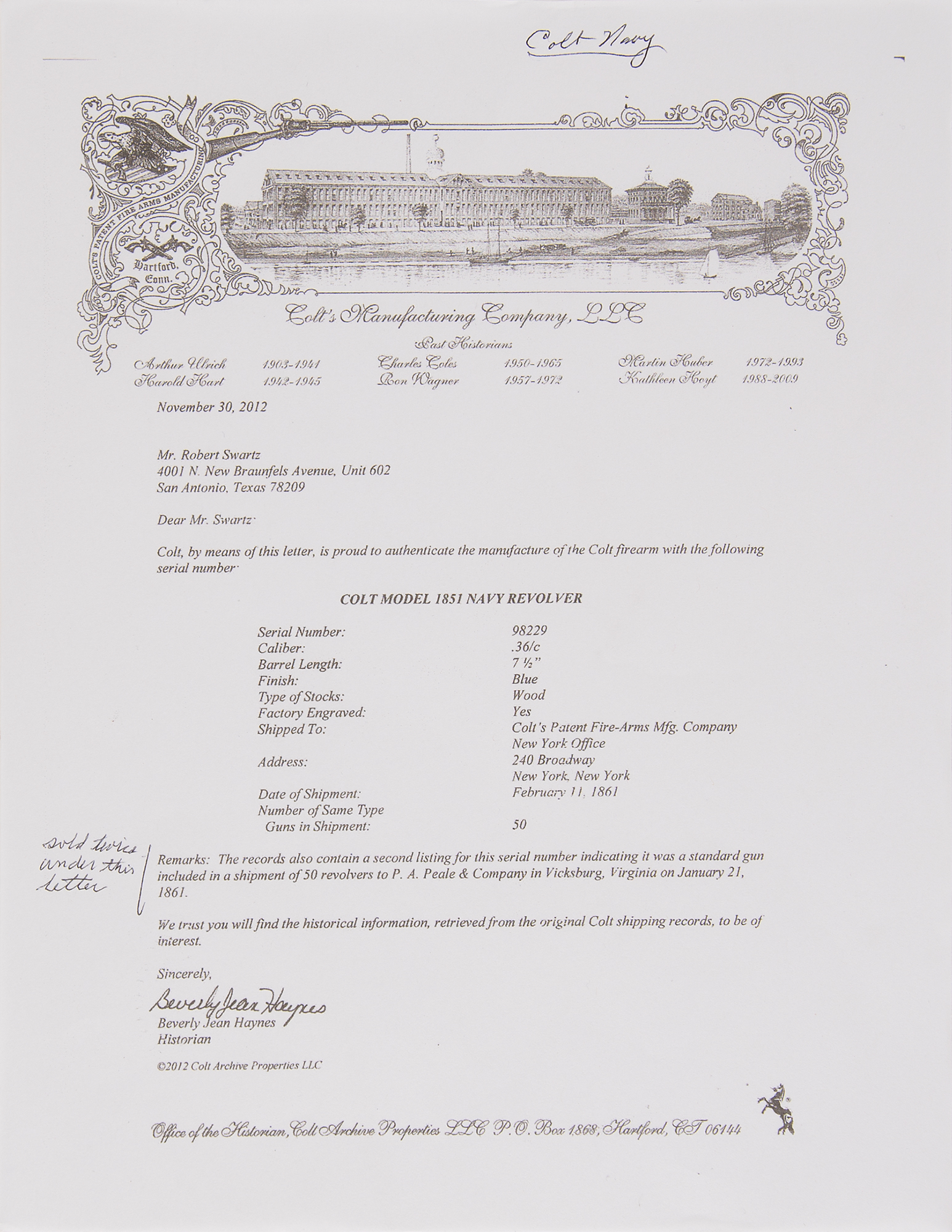 Previous auctions of this gun (Christie’s 2001 and RR Auction 2011) relied on an earlier archive letter that referenced only the unengraved Peale revolver. As a result, those sales did not reflect a proper provenance. The new letter included with this lot is the proper and definitive record for this engraved Colt-Hays presentation.