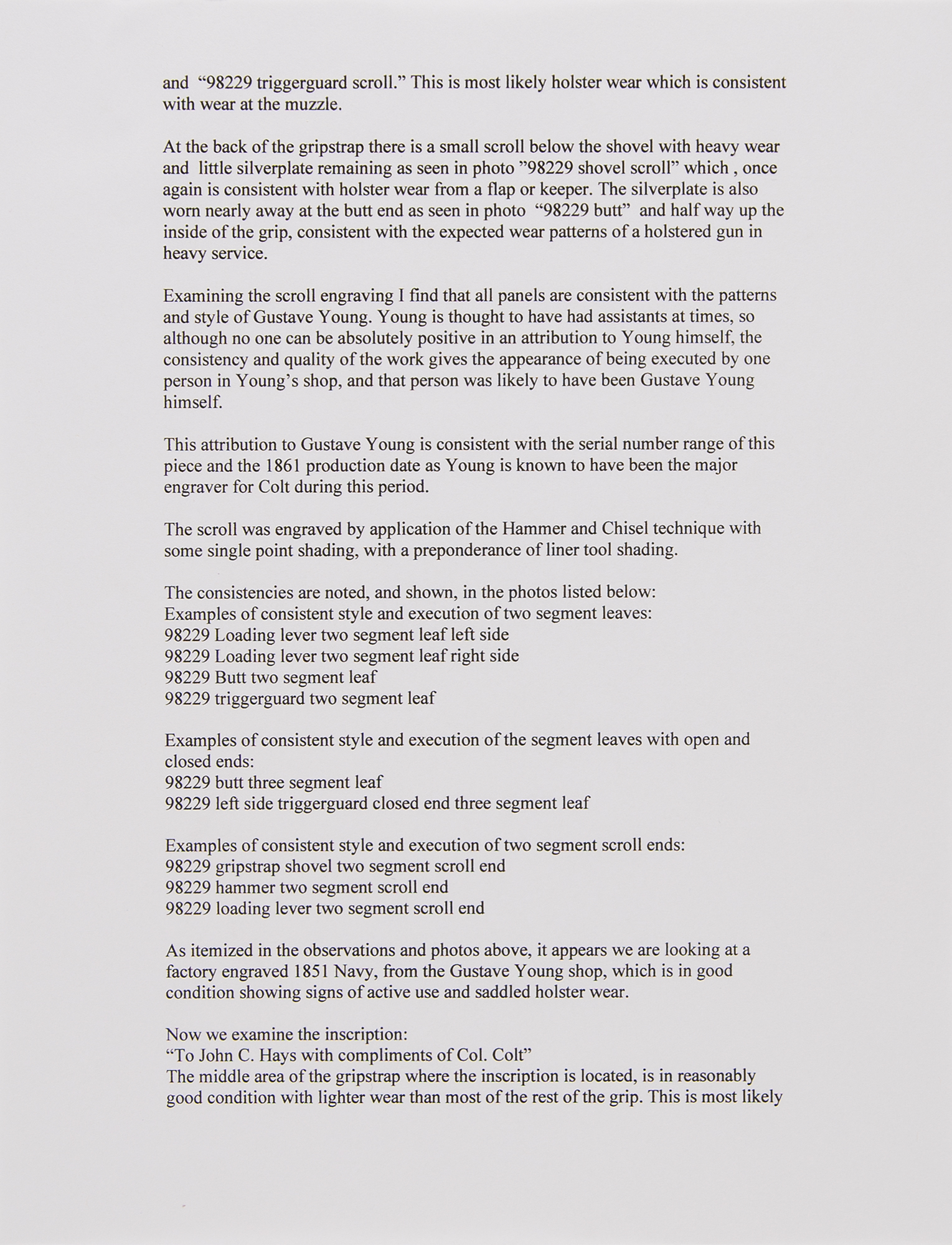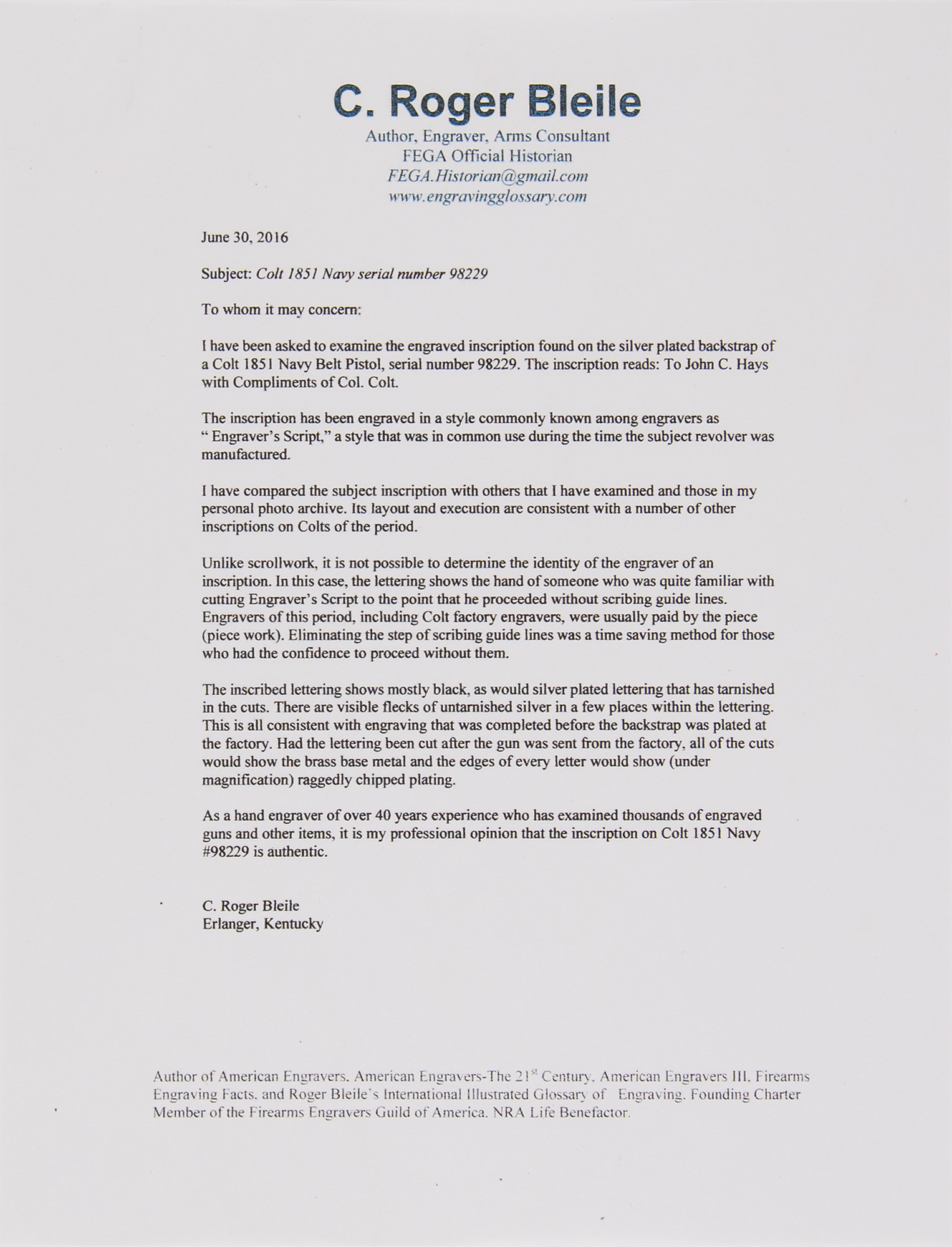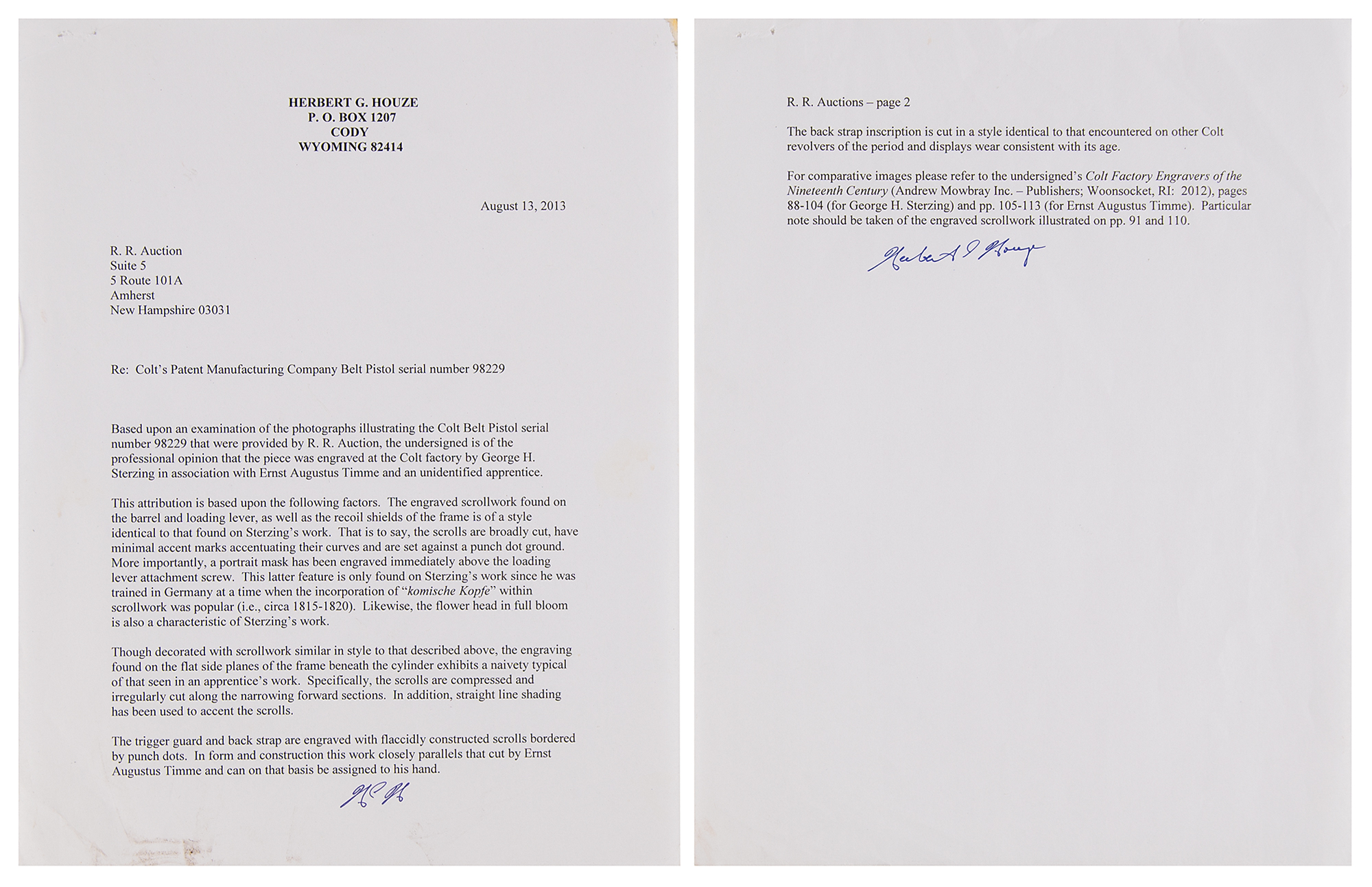 Included with the lot are letters and professional opinions from leading authorities in Colt history and engraving: