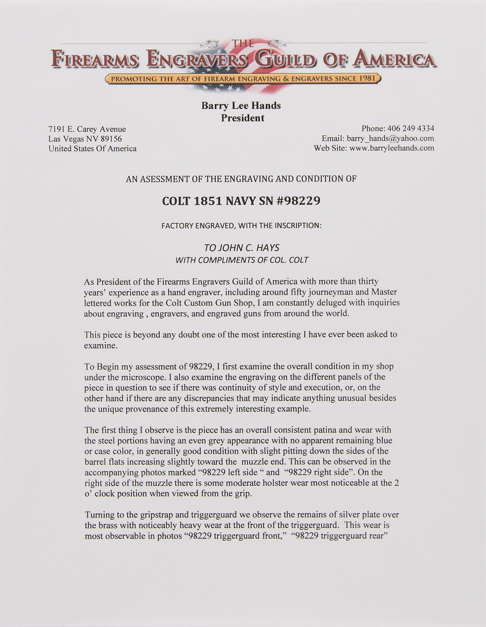 UPDATE: This revolver has previously appeared at auction (Christie?s 2001 and RR Auction 2011), but both sales relied on an outdated Colt Archive letter referencing an unengraved revolver bearing the same serial number. The newly issued Colt Archive letter definitively attributes this factory-engraved and inscribed revolver?with Hays?s portrait?to the Hays presentation. Earlier sales did not reflect this documentation, and previous price results are therefore not indicative of this revolver?s now-established historical importance.