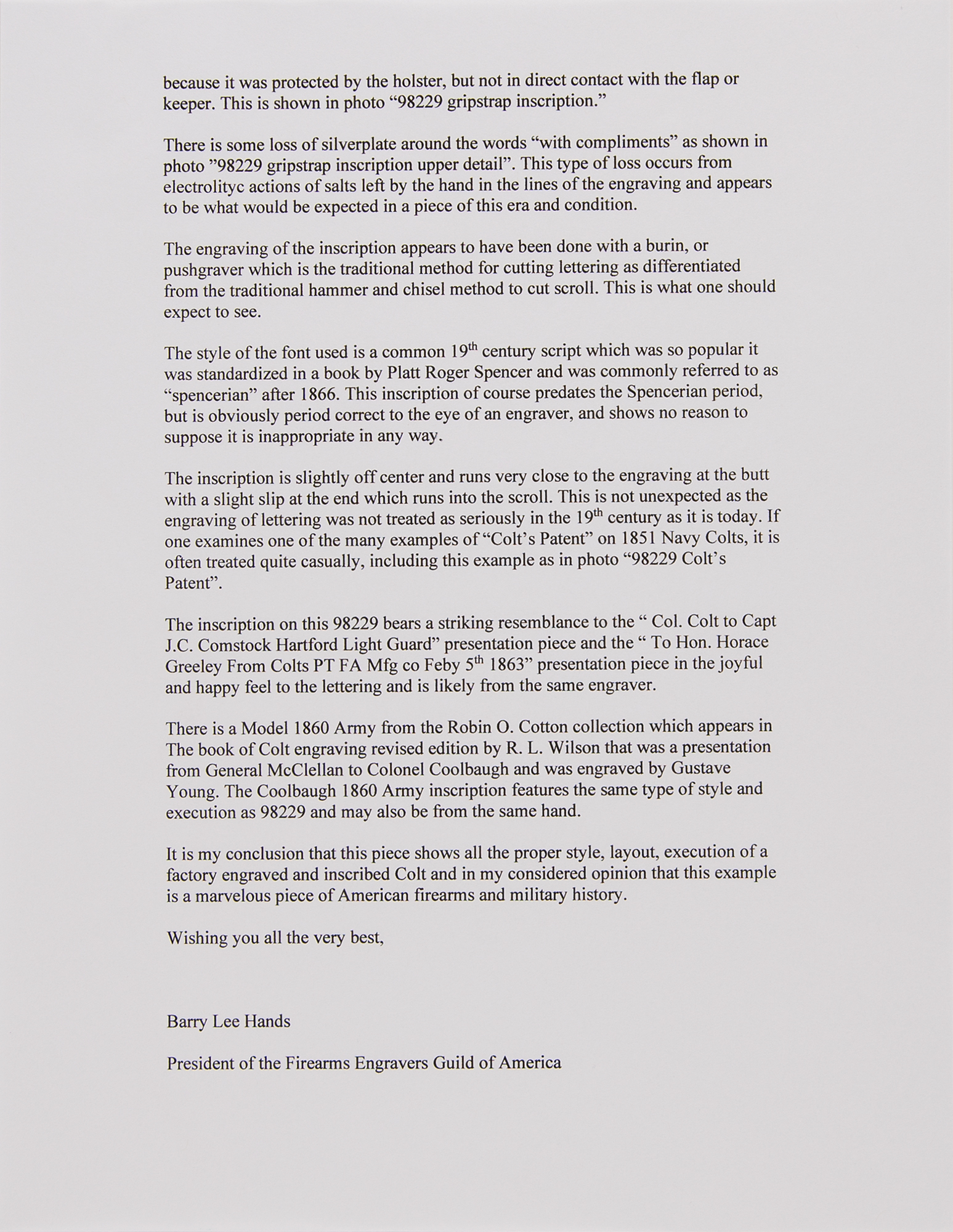 Barry Lee Hands identified the inscription font as typical of the 19th century, standardized by Platt Rogers Spencer, and “obviously period correct to the eye of an engraver.” He compared it favorably with other Colt presentation revolvers, including those gifted to Capt. J.C. Comstock (Hartford Light Guard) and Hon. Horace Greeley (Feb. 5, 1863). Hands concluded: “This piece shows all the proper style, layout, and execution of a factory-engraved and inscribed Colt. In my considered opinion, this example is a marvelous piece of American firearms and military history.”