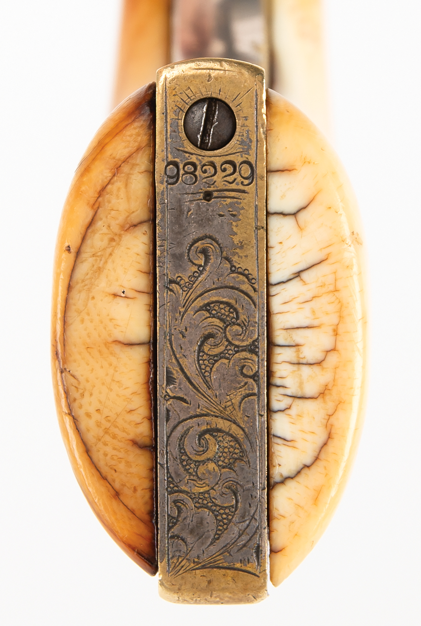 The steel exhibits a rich, even gray patina. Approximately 60% of the original silver plating remains on the brass gripstraps. The one-piece ivory grip is beautifully aged, showing minor handling wear and a mellow tone consistent with its age and authenticity. The bore is very good, and the revolver functions properly.