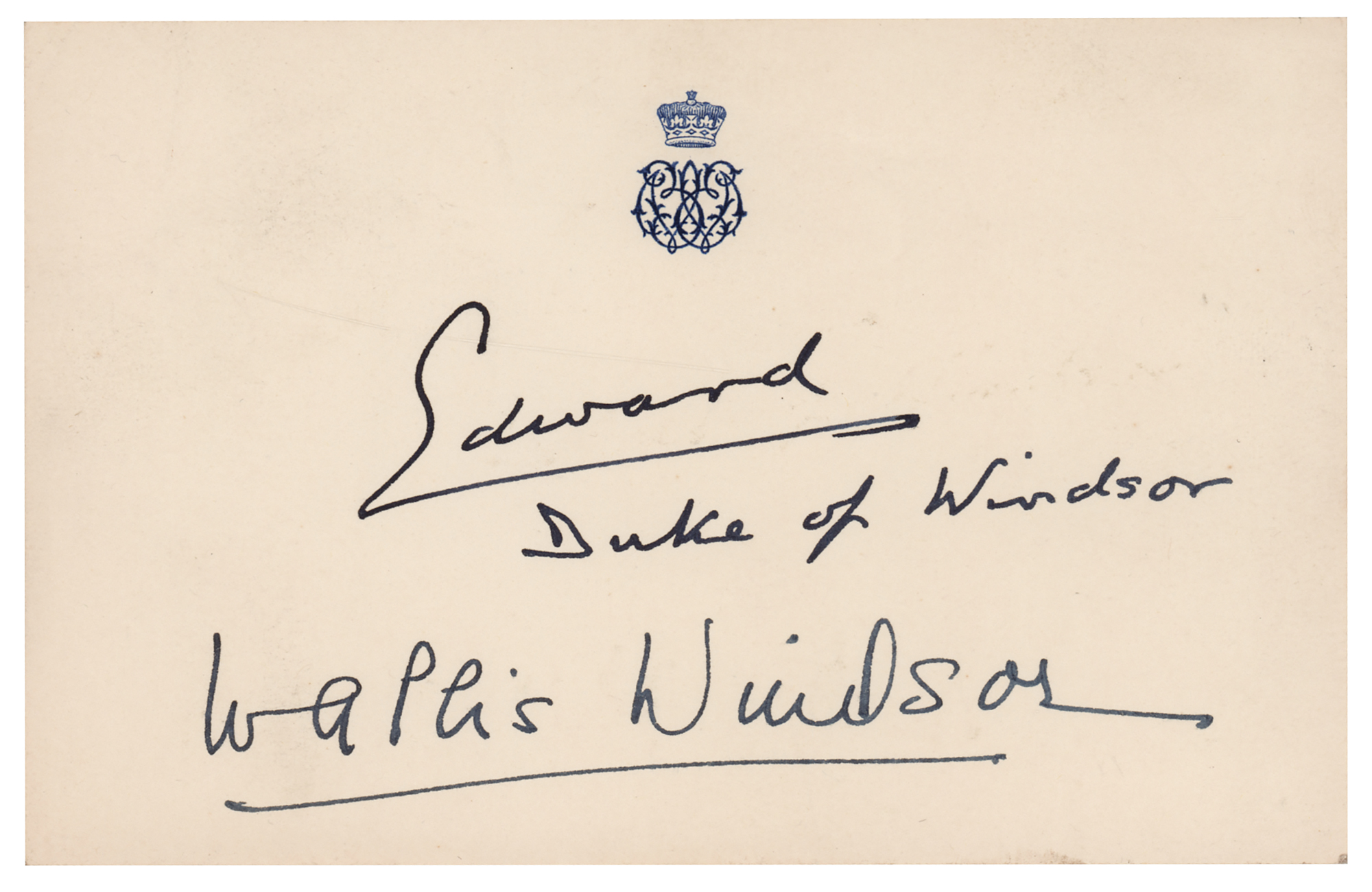 Choice vintage fountain pen signatures, "Edward, Duke of Windsor" and "Wallis Windsor,” on an off-white 5.5 x 3.5 slip embossed with a royal crest. In very fine condition.
