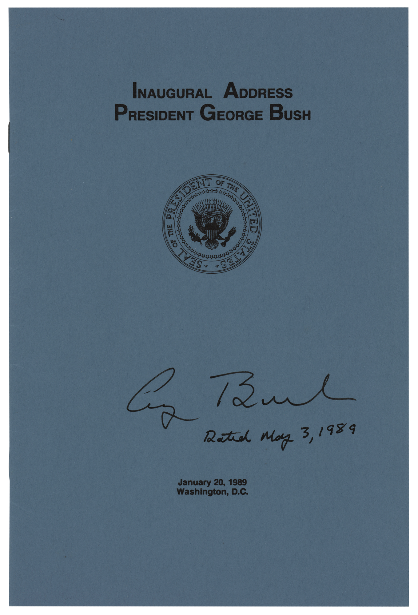 Pamphlet containing the text of President George Bush's inaugural address, eight pages, 6 x 9, signed on the front cover in black felt tip as president, "George Bush, Dated May 3, 1989." Delivered on January 20, 1989, President Bush's speech begins: "There is a man here who has earned a lasting place in our hearts and in our history. President Reagan, on behalf of our Nation, I thank you for the wonderful things that you have done for America. I have just repeated word for word the oath taken by George Washington 200 years ago, and the Bible on which I placed my hand is the Bible on which he placed his. It is right that the memory of Washington be with us today, not only because this is our Bicentennial Inauguration, but because Washington remains the Father of our Country. And he would, I think, be gladdened by this day; for today is the concrete expression of a stunning fact: our continuity these 200 years since our government began. We meet on democracy's front porch, a good place to talk as neighbors and as friends. For this is a day when our nation is made whole, when our differences, for a moment, are suspended." In very fine condition.
