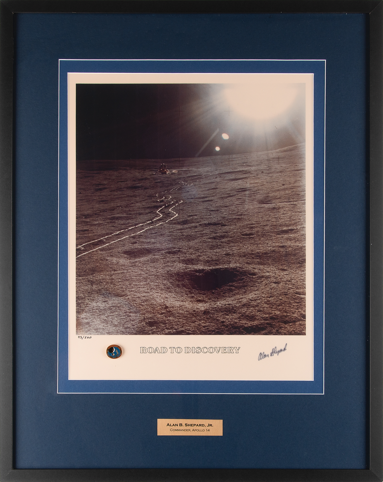 Laminated limited edition color glossy 14.75 x 18.5 photo of the reflective tracks made by the Apollo 12 equipment carrier, with the Lunar Module Intrepid visible in the distance, entitled 'Road to Discovery,' numbered 93/500, signed in the lower border in black felt tip by Alan Shepard. Double-matted and framed with an enameled Apollo 14 pin to an overall size of 23.25 x 29.25. In fine condition, with light blurring to the signature.