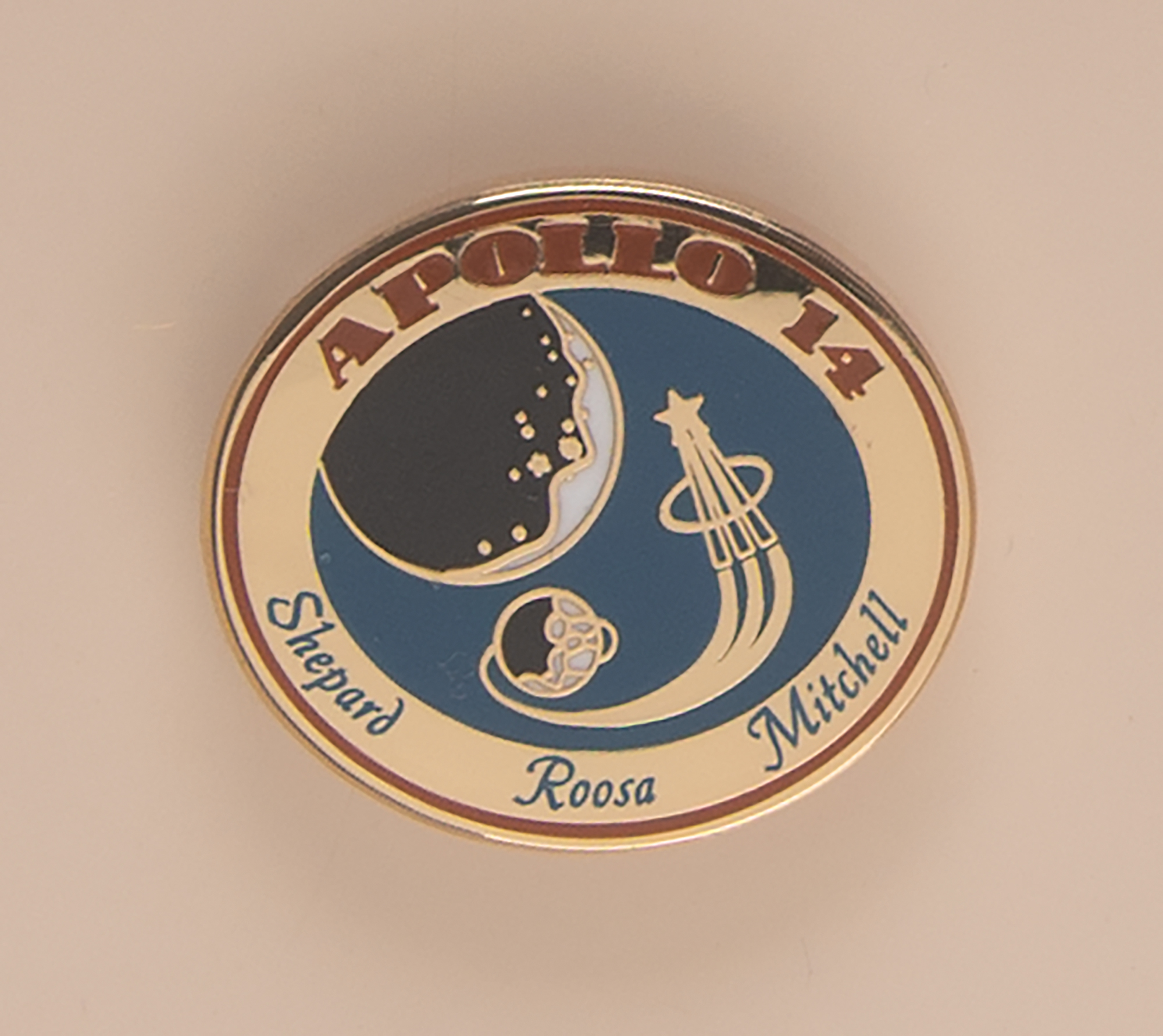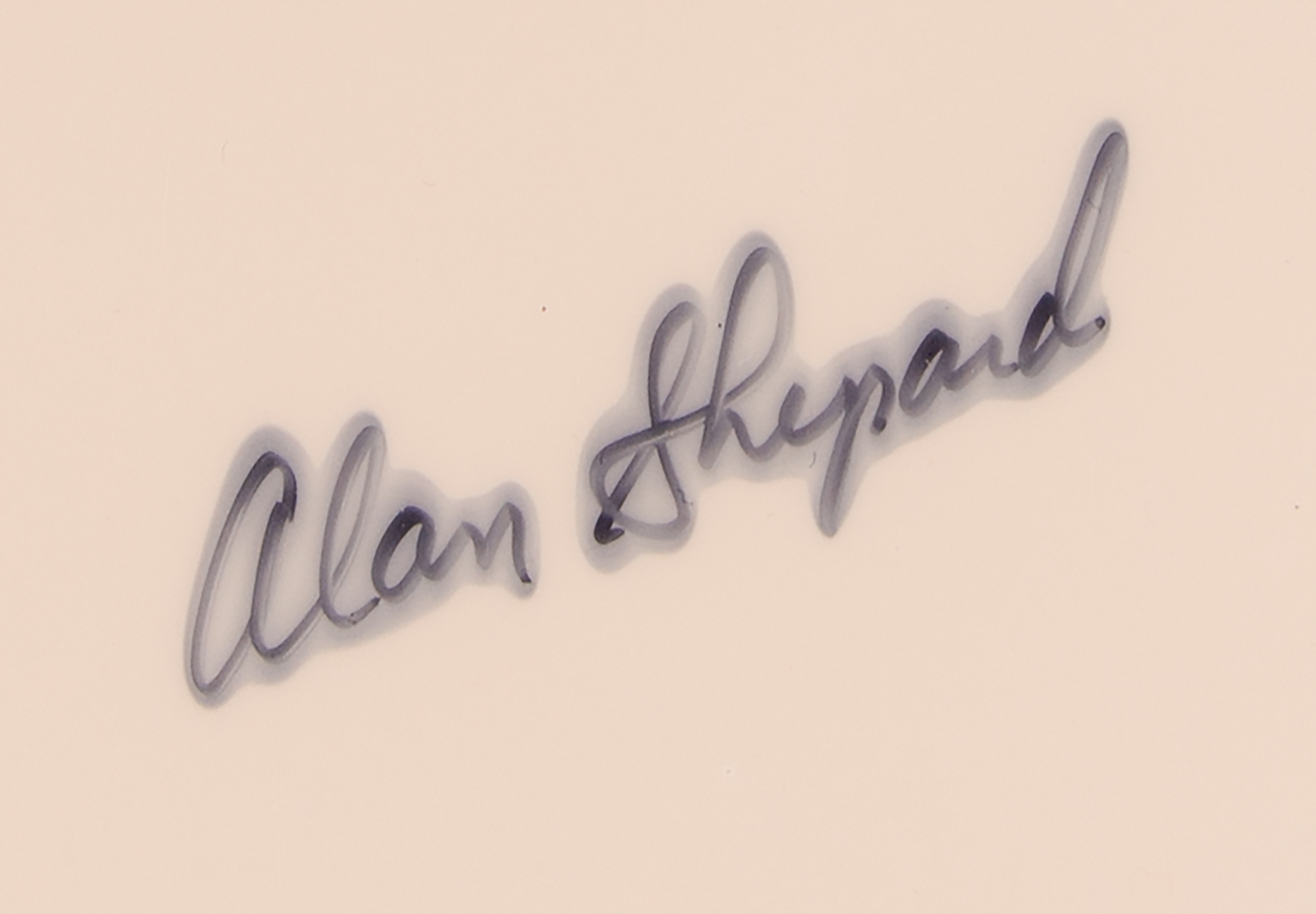 Laminated limited edition color glossy 14.75 x 18.5 photo of the reflective tracks made by the Apollo 12 equipment carrier, with the Lunar Module Intrepid visible in the distance, entitled 'Road to Discovery,' numbered 93/500, signed in the lower border in black felt tip by Alan Shepard. Double-matted and framed with an enameled Apollo 14 pin to an overall size of 23.25 x 29.25. In fine condition, with light blurring to the signature.