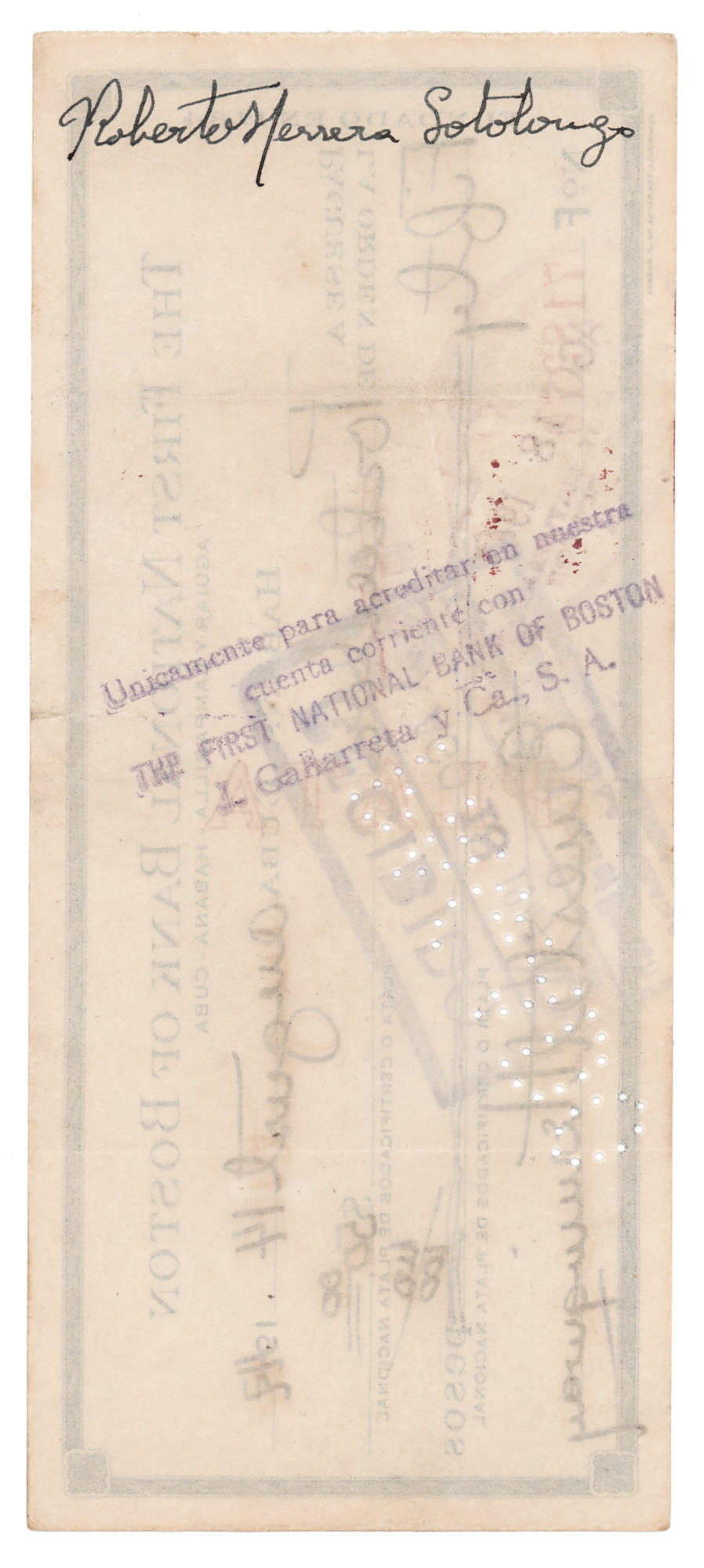 First National Bank of Boston check, 6.5 x 2.75, filled out and signed by Hemingway, "Ernest M. Hemingway," payable to Portador [Bearer] for $50, August 14, 1947. Endorsed on the reverse in fountain pen by Roberto Herrera. In fine condition. Herrera was Hemingway's close friend, part-time secretary, and brother of his Cuban doctor; he frequently accompanied the writer on his exploits aboard the famous fishing boat Pilar.