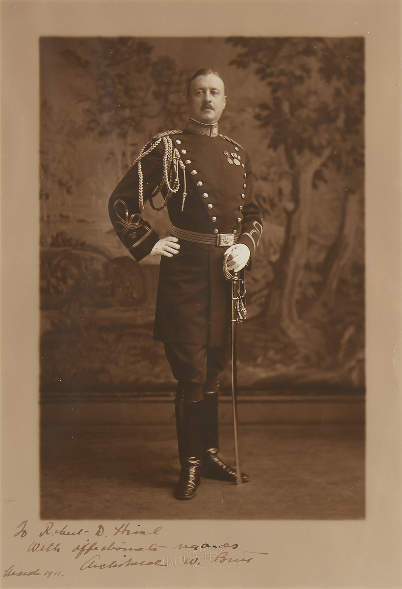 American military officer (1865–1912) who served as an influential aide to presidents Roosevelt and Taft before perishing in the sinking of the Titanic. Scarce vintage matte-finish 9.25 x 13.5 portrait of Butt in uniform by Harris & Ewing, signed and inscribed in fountain pen to a New York Sun newspaper correspondent, "To Robert D. Heinl, with affectionate regards, Archibald W. Butt, March 1911.” In fine condition, with chipping to the edges and corners of the original frame. A scarce and desirable format as the first signed photograph of Archibald Butt that we have ever offered.