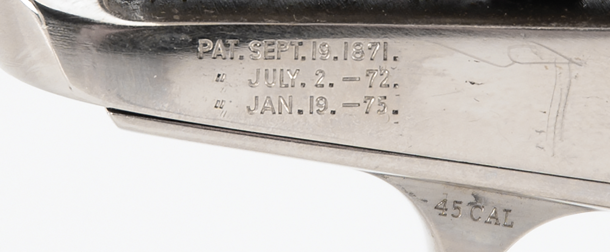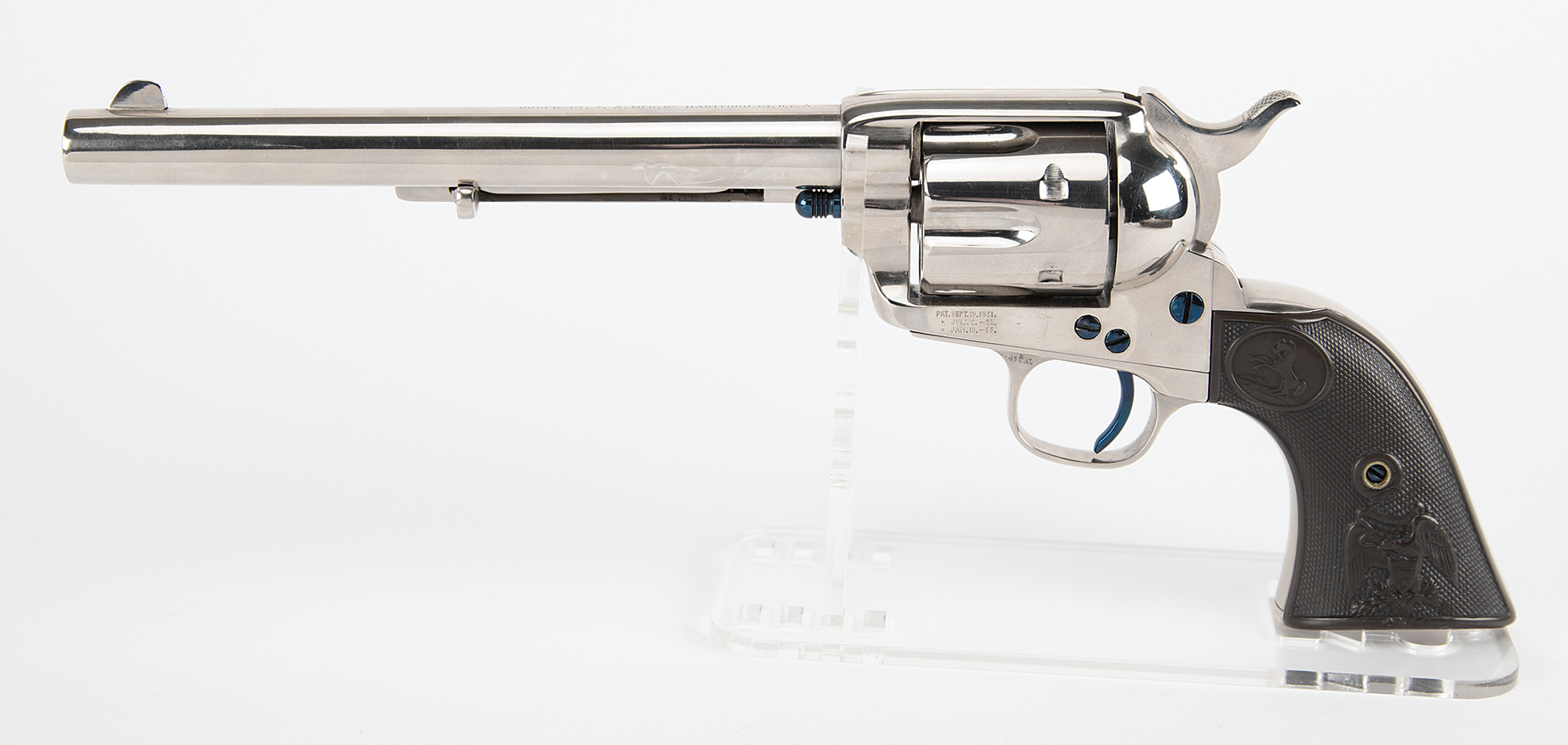 From the collection of Caldwell Hart Colt, the only son of Samuel Colt— a beautifully restored Colt Single Action Army .45 caliber revolver handgun manufactured by the Colt Patent Firearms Manufacturing Company in 1882. Serial #81350, .45 Colt, 7 1/2" barrel, the top of which is marked “Colt’s PT. F. A. Mfg. Co. Hartford, CT, U.S.A.” The revolver's serial number “81350” is found on the trigger guard, grip frame, and frame, and the loading gate bears the assembly number “1350.” The left side of the frame bears the patent stamps, and the left side of the trigger guard shows the caliber as “45 CAL.”