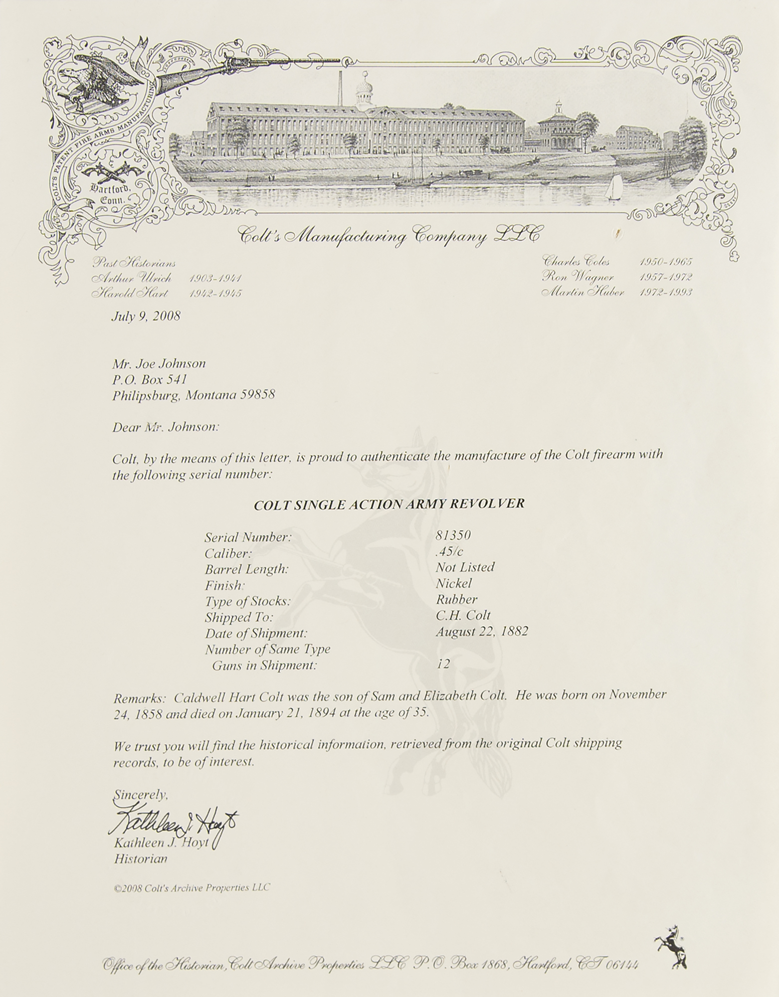 Accompanied by its 2008 letter of authenticity from Kathleen Hoyt, the historian of the Colt Manufacturing Company, confirming the revolver's configuration and listing it as part of a shipment of 12 guns shipped to “C. H. Colt” on August 22, 1882. The remarks section reads: “Caldwell Hart Colt was the son of Sam and Elizabeth Colt. He was born on November 24, 1858 and died on January 21, 1894 at the age of 35.”