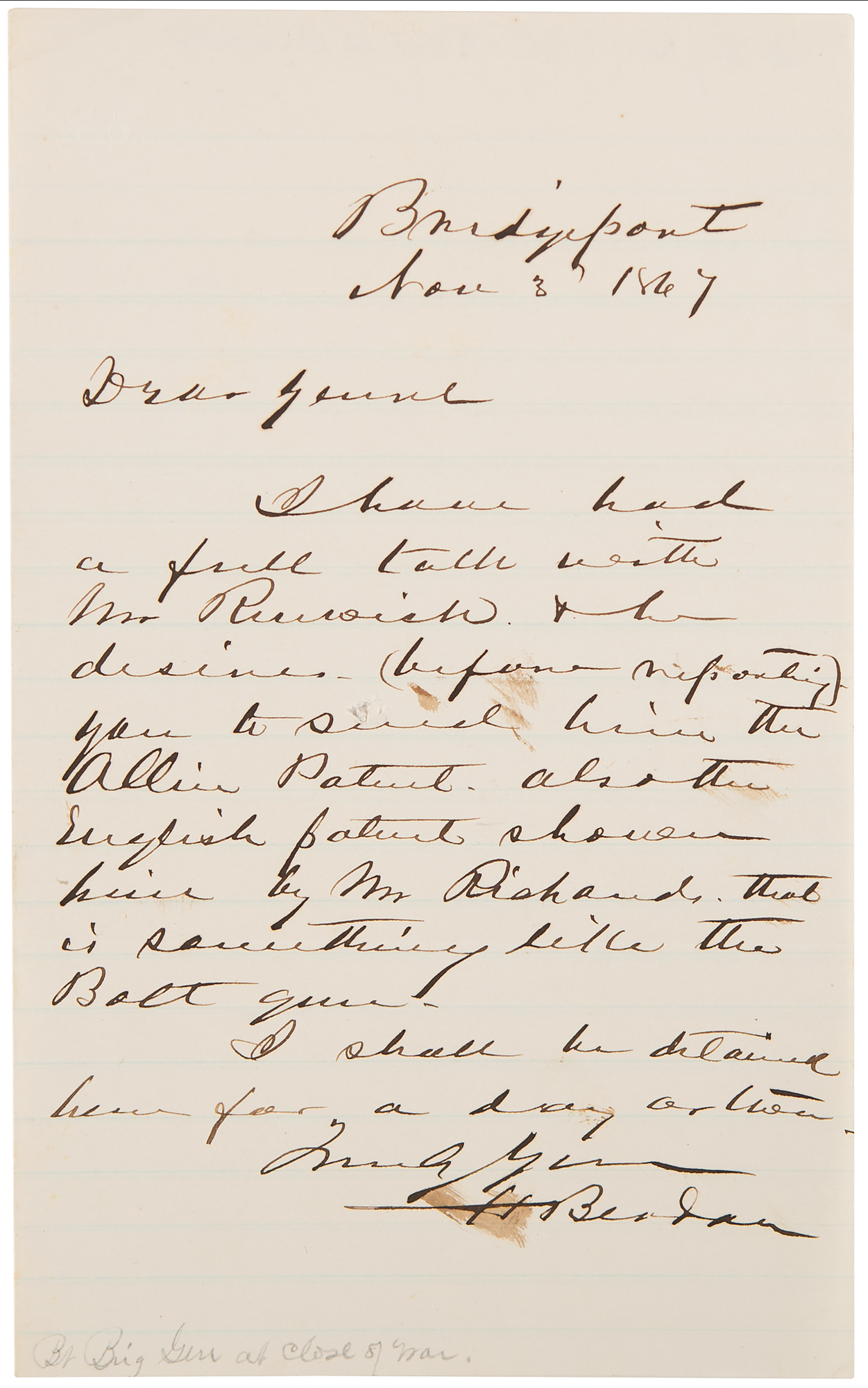 Engineer, inventor, and Civil War officer (1824-1893) who was a world-renowned marksman and the inventor of the Berdan rifle and other weapons. ALS signed "H. Berdan," one page, 5 x 8.25, November 3, 1867. Addressed from Bridgeport, Connecticut, a handwritten letter that begins “Dear General [General William B. Franklin],” in full: “I have had a full talk with Mr. Renwick & he desires (before reporting) you to send him the Allin Patent, also the English patent shown him by Mr. Richards [Colt's leading mechanical engineer] that is something like the Bolt gun [Berdan Type 3 trapdoor first mentioned to Franklin on March 16, 1867]. I shall be detained here for a day or two.” In fine condition. Accompanied by hardcover copy of the ‘State of New York Adjutant General’s Report, Vol. 1, 1868,” and an issue of The Texas Gun Collector from Spring 2017, which contains Robert Swartz’s informative article ‘Breaking Into Breech-Loading, The Colt-Berdan Trapdoor.’