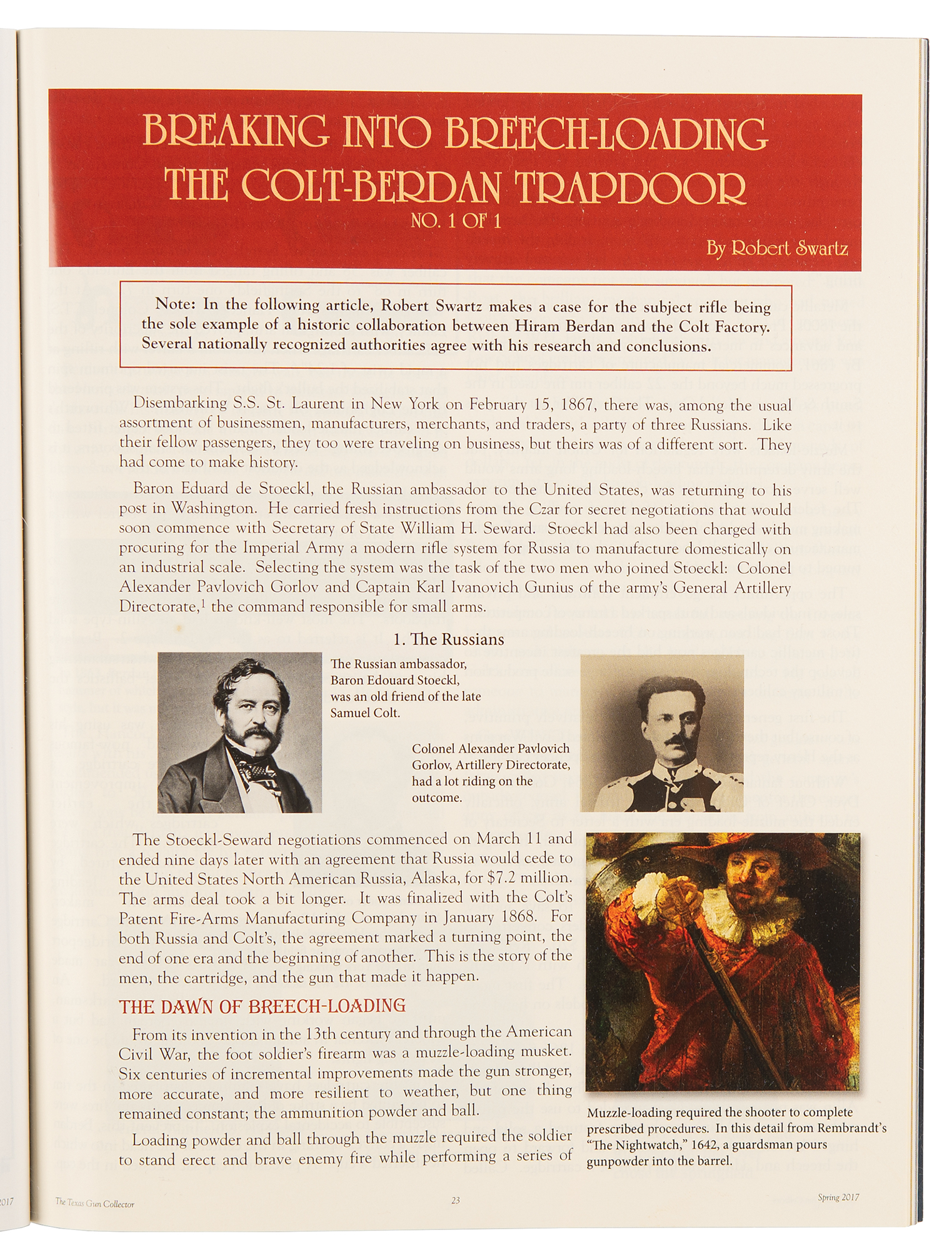 In 1867, when the New York Adjutant General Board conducted a competition for the conversion of muzzle-loading arms to breechloaders, Hiram Berdan entered two types of trapdoor conversions, both manufactured by Colt's Patent Fire-Arms. The Board suggested that Berdan's models needed an improved means to prevent the breechblock from flying open when firing.