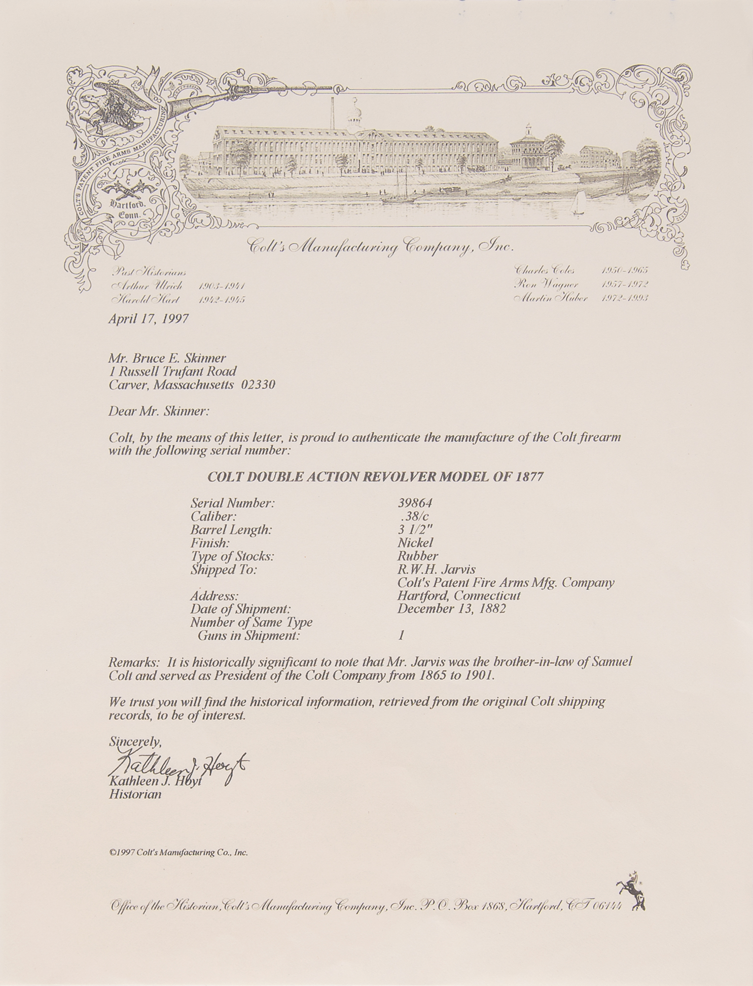 Accompanied by a 1997 letter of authenticity from the Colt Manufacturing Company, confirming the revolver's configuration and listing it as a single shipment that left Colt’s Hartford factory on December 13, 1882, to R. W. H. Jarvis.