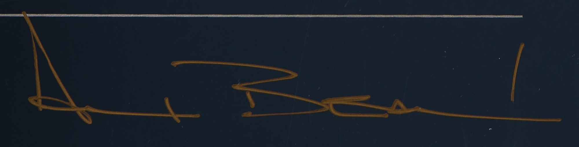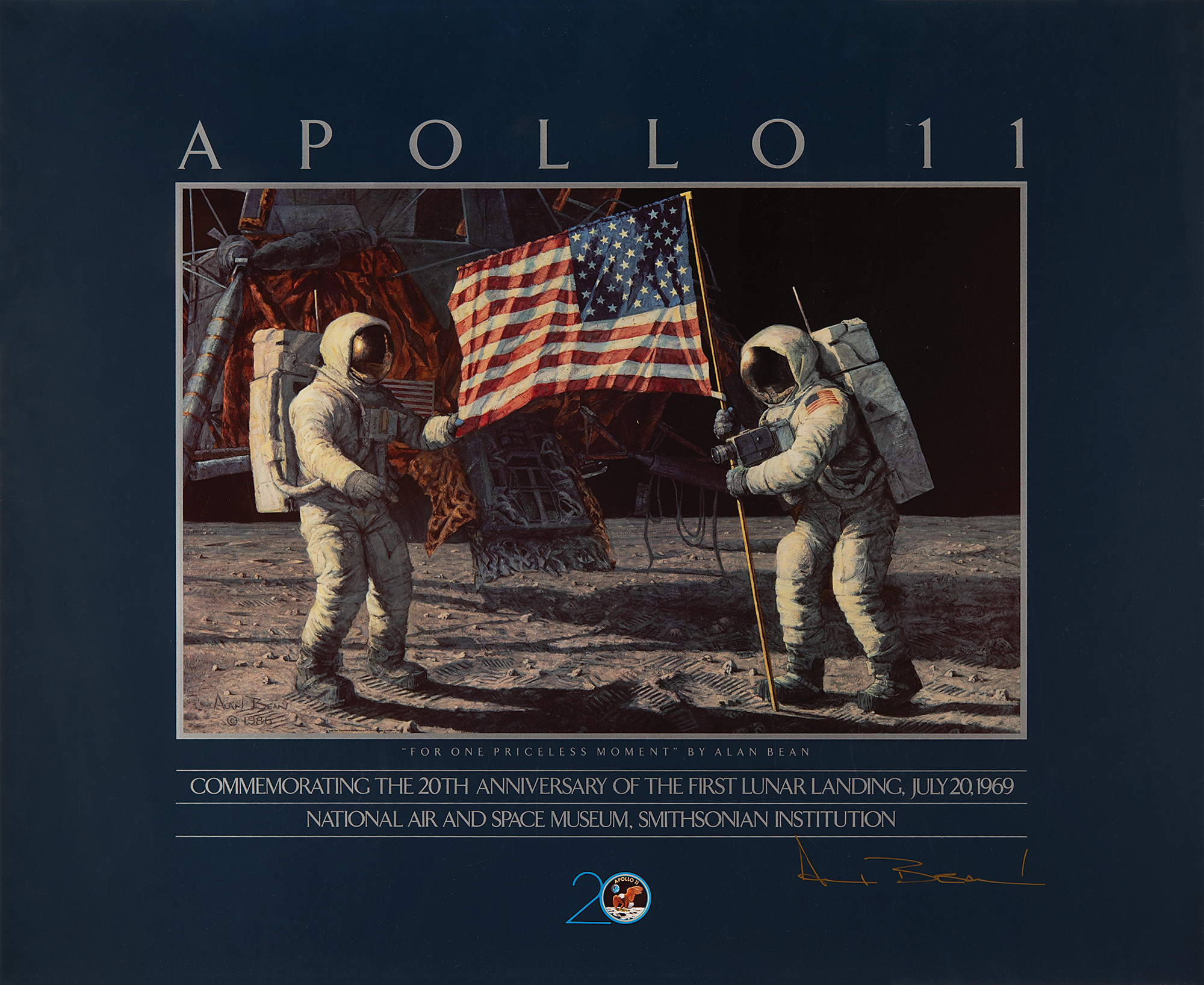 Color 28 x 23 poster print of Alan Bean's painting 'For One Priceless Moment,' honoring the 20th anniversary of Apollo 11, signed in the lower border in gold ink by the Apollo 12 moonwalker, "Alan Bean." Rolled and in fine condition, with some small creases and scuffs in the wide side borders.