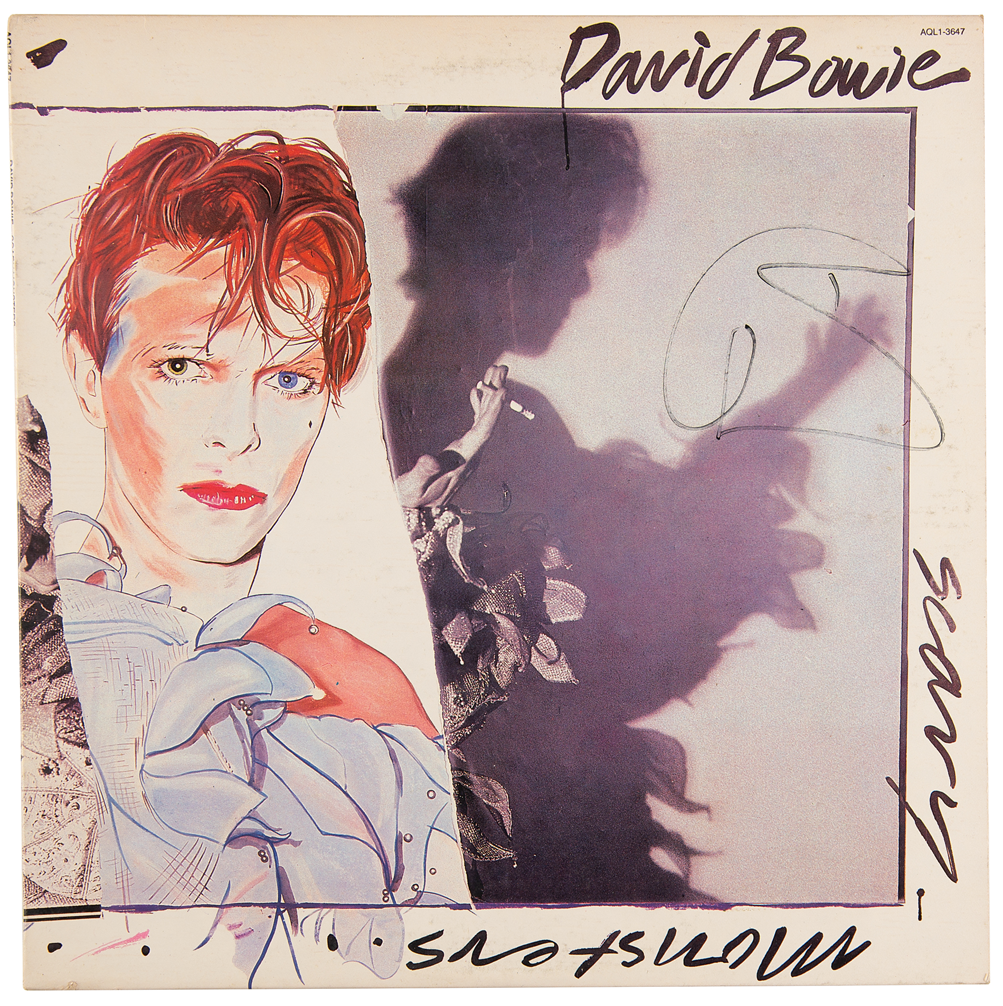 Scary Monsters album signed on the front cover in black felt tip by David Bowie. In fine condition, with light scuffing. The record is included.