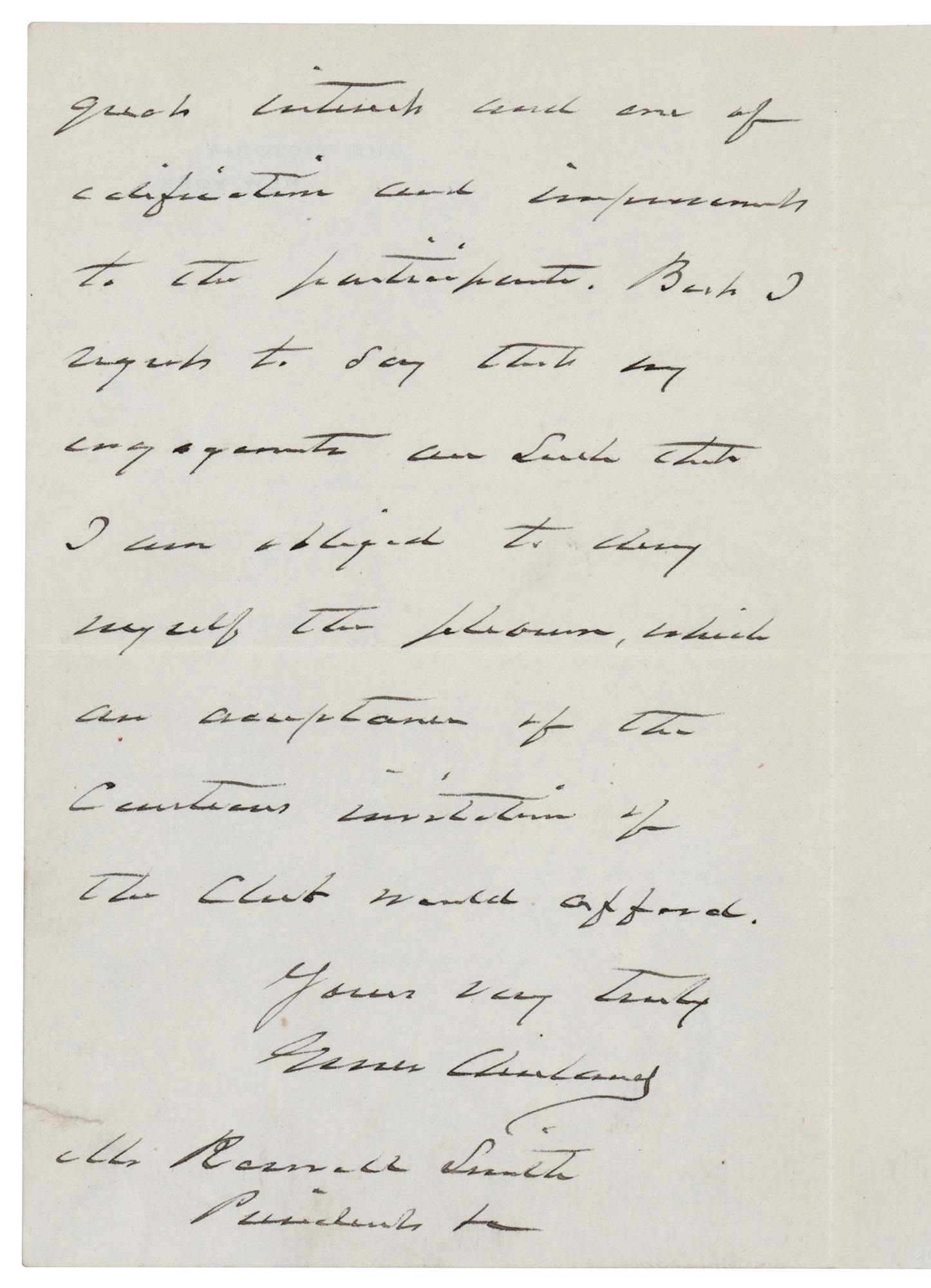ALS signed "Grover Cleveland," one page both sides, 4 x 6, The Victoria letterhead, May 15, 1889. Handwritten letter to Roswell Smith, declining an invitation. In part: "I should be glad to be present at this meeting, for I know it will be an occasion of great interest and one of edification and improvement to the participants. But I regret to say that my engagements are such that I am obliged to deny myself the pleasure."