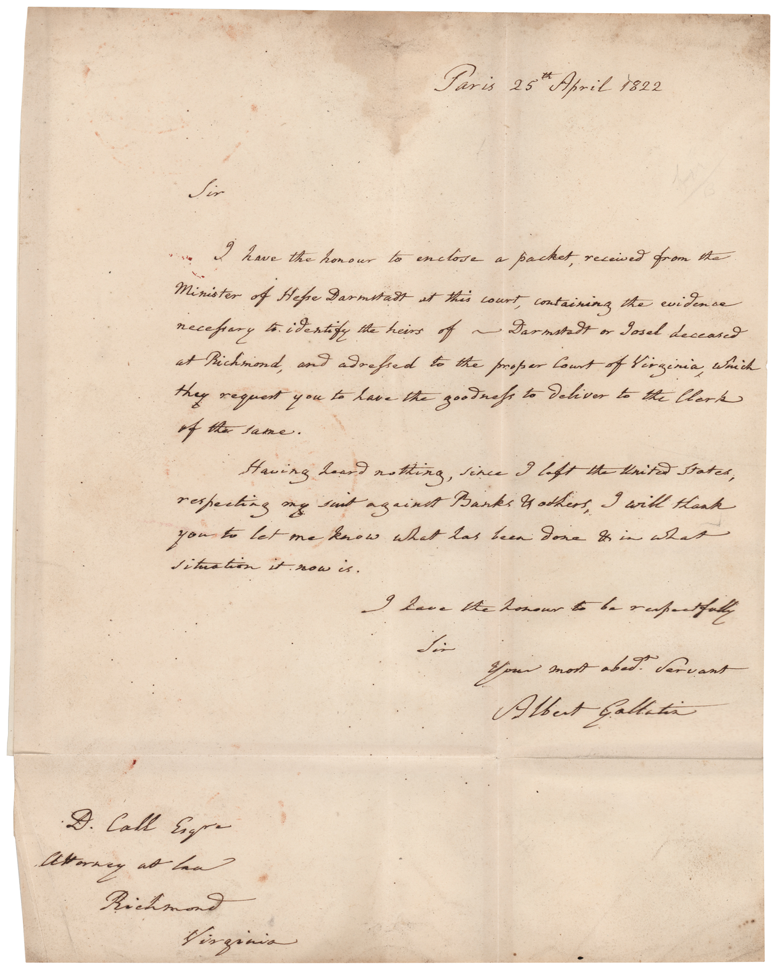 ALS signed "Albert Gallatin," one page, 7.75 x 10, April 25, 1822. Handwritten letter to an attorney, in part: "I have the honour to enclose a packet, received from the Minister of Hesse Darmstadt at this court, containing the evidence necessary to identify the heirs…Having heard nothing, since I left the United States, respecting my suit…I will thank you to let me know what has been done & in what situation it now is."