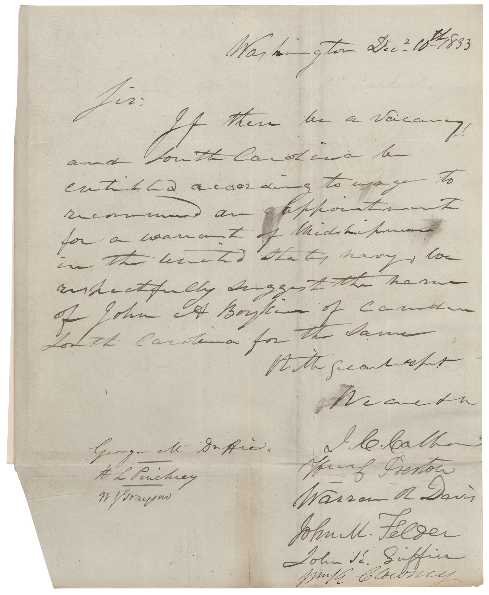 ALS signed "J. C. Calhoun," one page, 7.75 x 9.75, December 10, 1833. Handwritten letter regarding an appointment, in part: "If there be a vacancy, and South Carolina be entitled according to usage to recommend an appointment for a warrant of midshipman in the United States Navy, we respectfully suggest the name of John A. Boykin of Camden, South Carolina for the same." Signed at the conclusion by several members of South Carolina's delegation to Congress: John C. Calhoun, William C. Preston, Warren R. Davis, John M. Felder, John K. Griffin, William Clowney, George McDuffie, Henry L. Pinckney, and William J. Grayson.