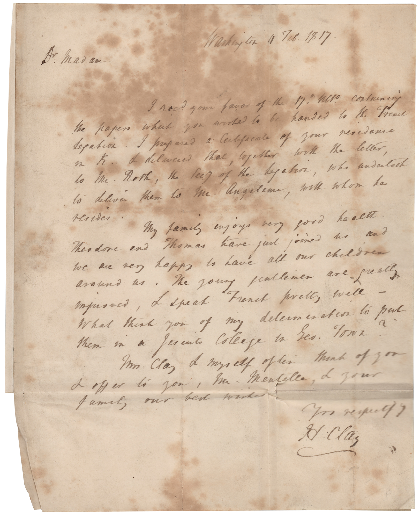ALS signed "H. Clay," one page, 7.5 x 9.75, February 4, 1817. Handwritten letter to a woman near Lexington, Kentucky, in part: "I rec'd your favor of the 17th ulto. containing the papers which you wished to be handed to the French Legation…My family enjoys very good health. Theodore and Thomas have just joined us and we are very happy to have all our children around us. The young gentlemen are greatly improved, & speak French pretty well. What think you of my determination to put them in a Jesuit's College in Geo. Town?" Addressed on the integral leaf in Clay's hand, and franked in the upper right: "Free, H. Clay."