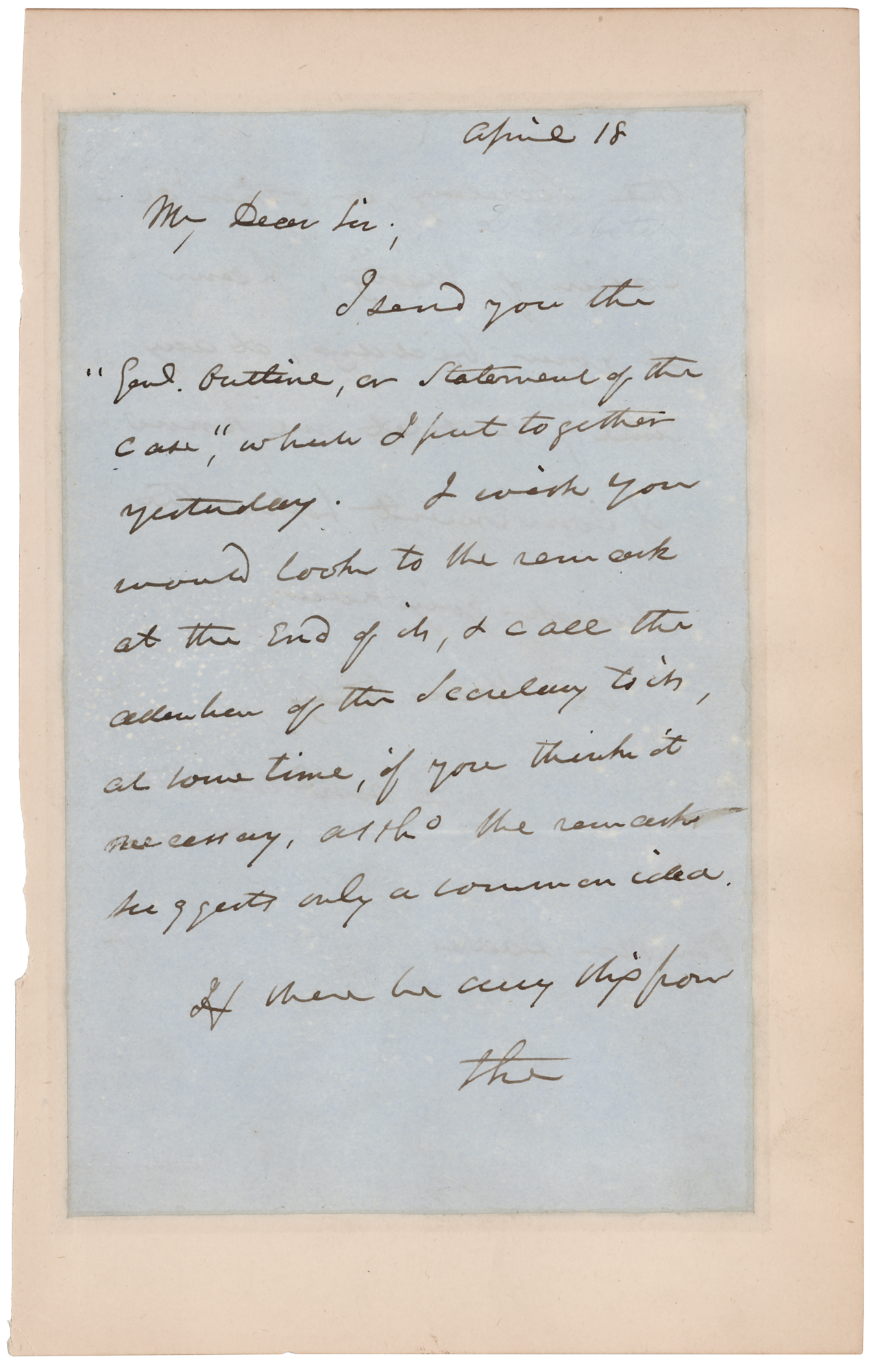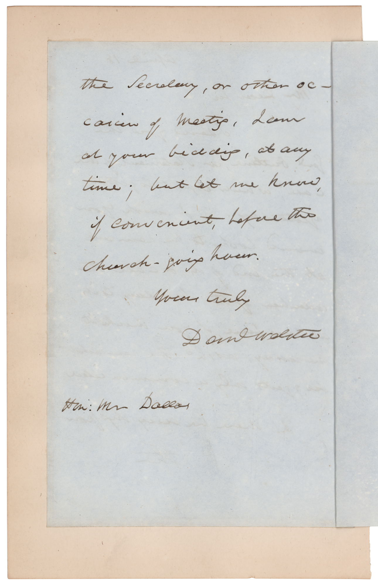 ALS signed "Dan'l Webster," one page both sides, 4.25 x 6.75, April 18, [no year]. Handwritten letter to "Hon. Mr. Dallas," in part: "I send you the 'Gen'l. outline, or statement of the case,' which I put together yesterday. I wish you would look to the remark at the end of it, & call the attention of the Secretary to it, at some time, if you think it necessary, altho' the remark suggests only a common idea." Inlaid into a larger sheet.