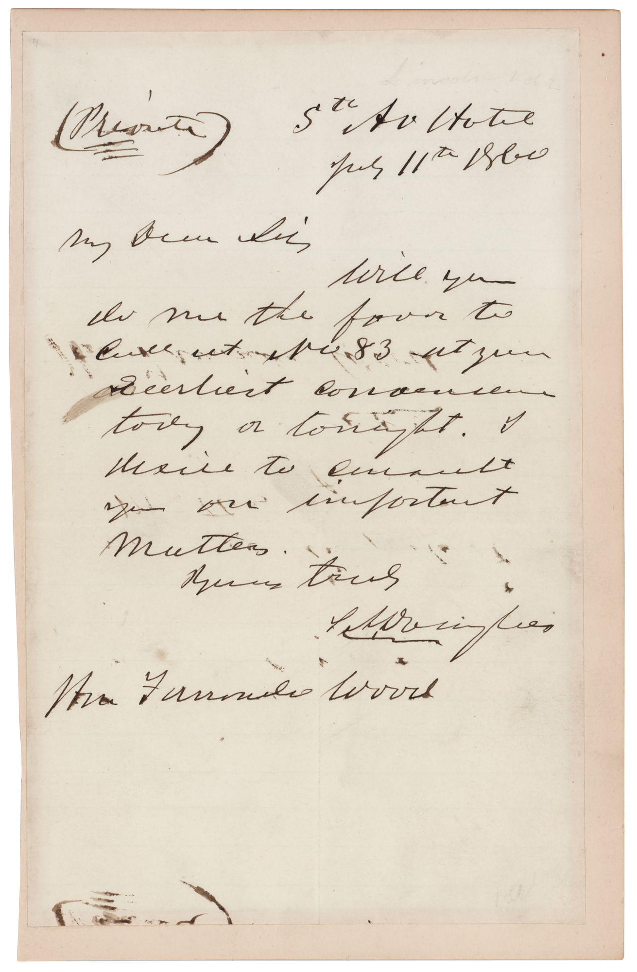 ALS signed "Stephen A. Douglas," one page, 5 x 7.75, July 11, 1860. Handwritten letter to Hon. Fernando Wood, in part: "Will you do me the favor to call at No. 83 at your earliest convenience today or tonight. I desire to consult you on important matters." Inlaid into a larger sheet.