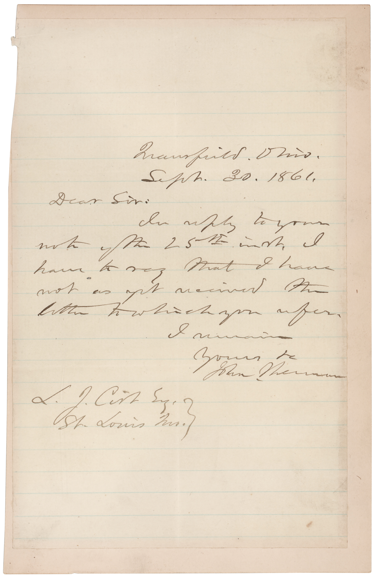 ALS signed "John Sherman," one page, 5 x 8, September 30, 1861. Handwritten letter following up on previous correspondence, in part: "I have to say that I have not as yet received the letter to which you refer." Inlaid into a larger sheet.