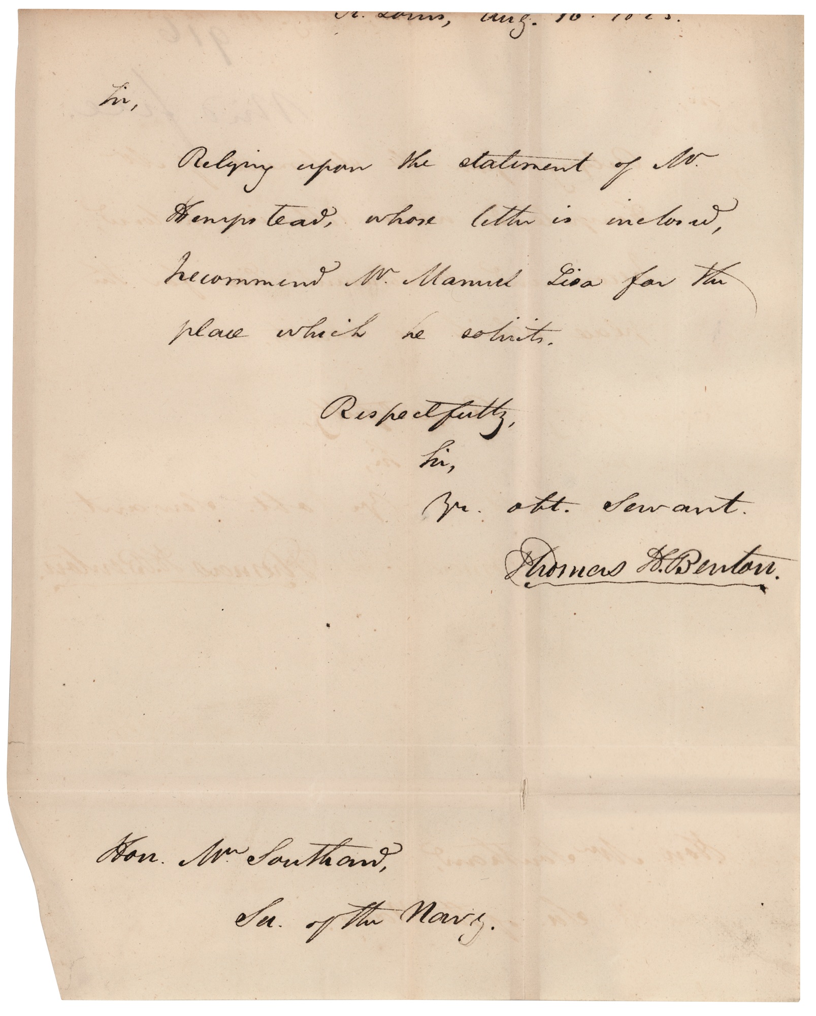ALS signed "Thomas H. Benton," one page, 7.5 x 9.75, August 10, [1820s]. Handwritten letter to Secretary of the Navy Samuel L. Southard, in part: "Replying upon the statement of Mr. Hempstead, whose letter is inclosed, I recommend Mr. Manuel Lisa for the place which he solicits."