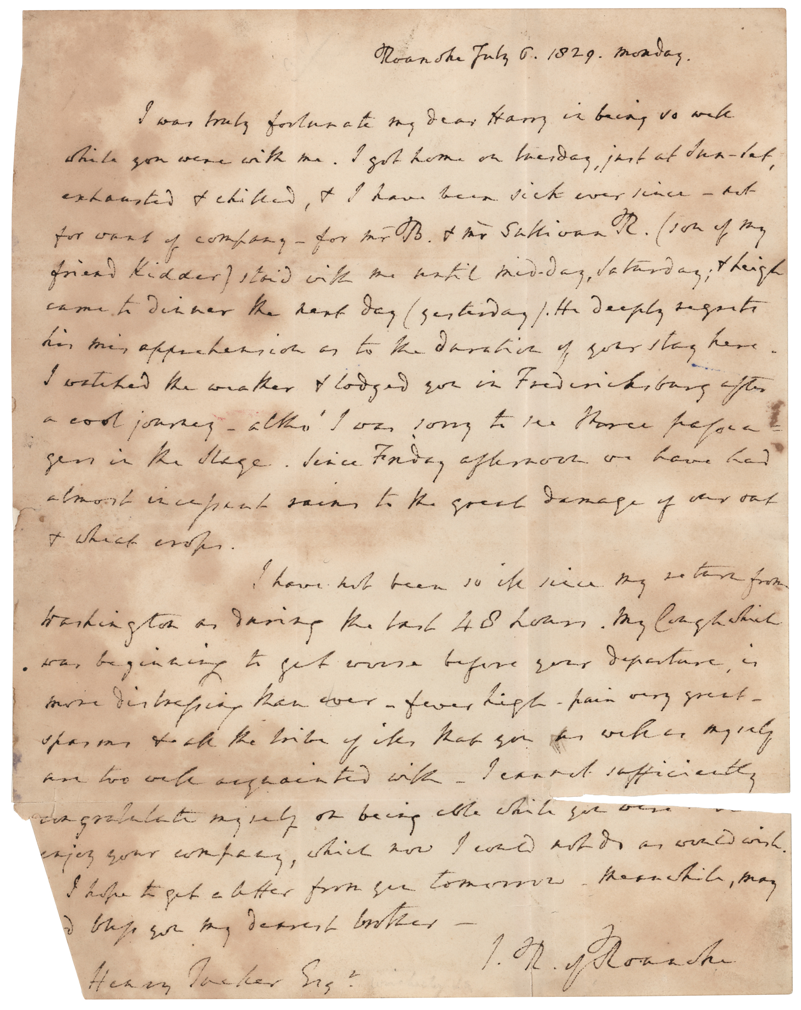 ALS signed "J. R. of Roanoke," one page, 7.75 x 9.75, July 6, 1829. Handwritten letter to Henry Tucker, in part: "I got home on Sunday, just at sun-set, exhausted & chilled, & I have been sick ever since—but for want of company—for Mr. B. & Mr. Sullivan R. (son of my friend Kidder) staid with me until mid-day, Saturday; & Leigh came to dinner the next day."