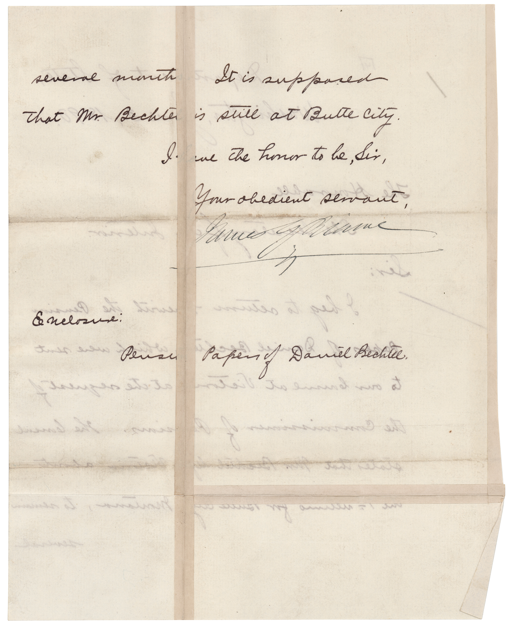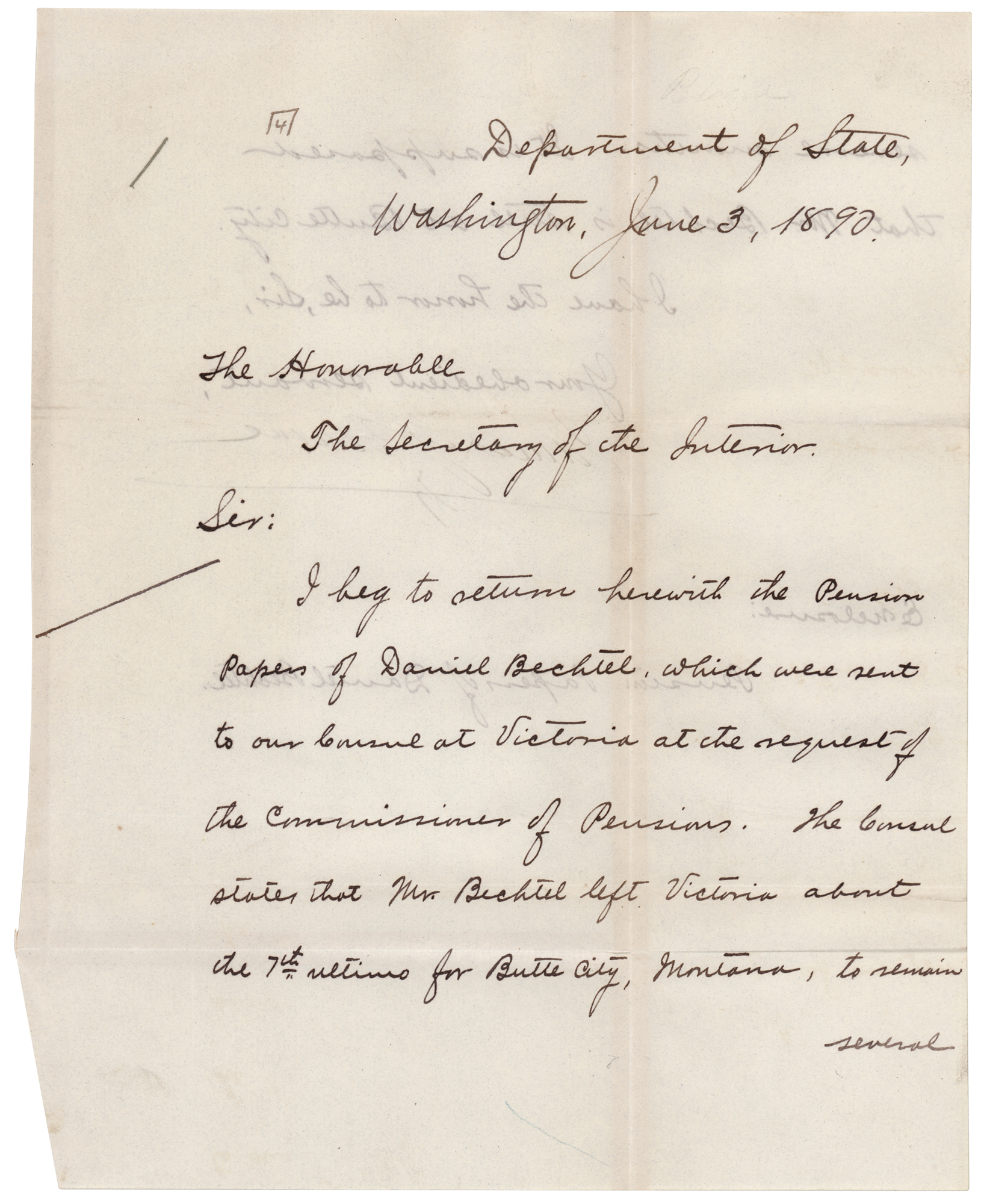 LS signed "James G. Blaine," one page, 7.75 x 10, June 3, 1890. Handwritten letter to Secretary of the Interior John Willock Noble, in part: "I beg to return herewith the Pension Papers of Daniel Bechtel, which were sent to our Consul at Victoria at the request of the Commissioner of Pensions. The Consul states that Mr. Bechtel left Victoria about the 7th ultimo. for Butte City, Montana, to remain several months."