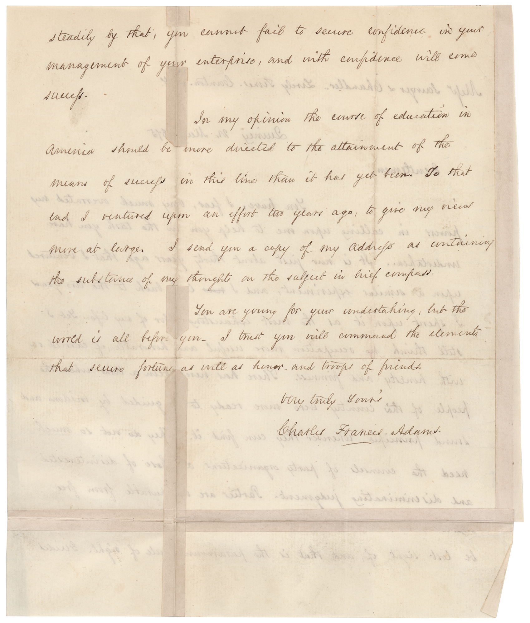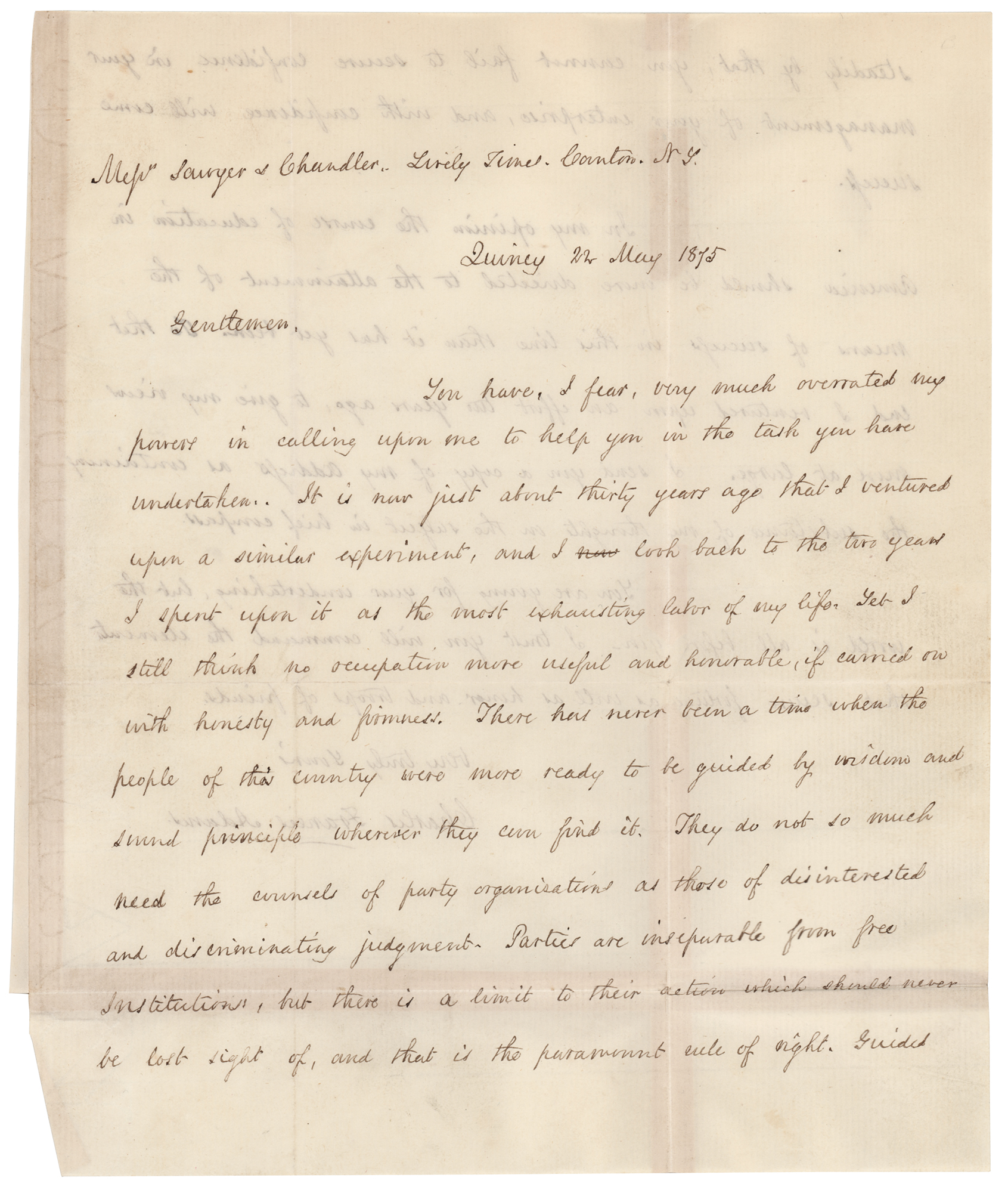 ALS signed "Charles Francis Adams," one page both sides, 7.25 x 9, May 22, 1875. Handwritten letter to "Messrs. Sawyer & Chandler," in part: "You have, I fear, very much overrated my powers in calling upon me to help in the task you have undertaken. It is now just about thirty years ago that I ventured upon a similar experiment, and I look back to the two years I spent upon it as the most exhausting labor of my life. Yet I still think no occupation more useful and honorable, if carried on with honesty and firmness. There has never been a time when the people of this country were ready to be guided by wisdom and sound principles wherever they can find it. They do not so much need the counsels of party organisations as those of disinterested and discriminating judgment. Parties are inseparable from free Institutions, but there is a limit to their action which should never be lost sight of, and that is the paramount rule of right…In my opinion the course of education in America should be more directed to the attainment of the means of success in this line than it has yet been."