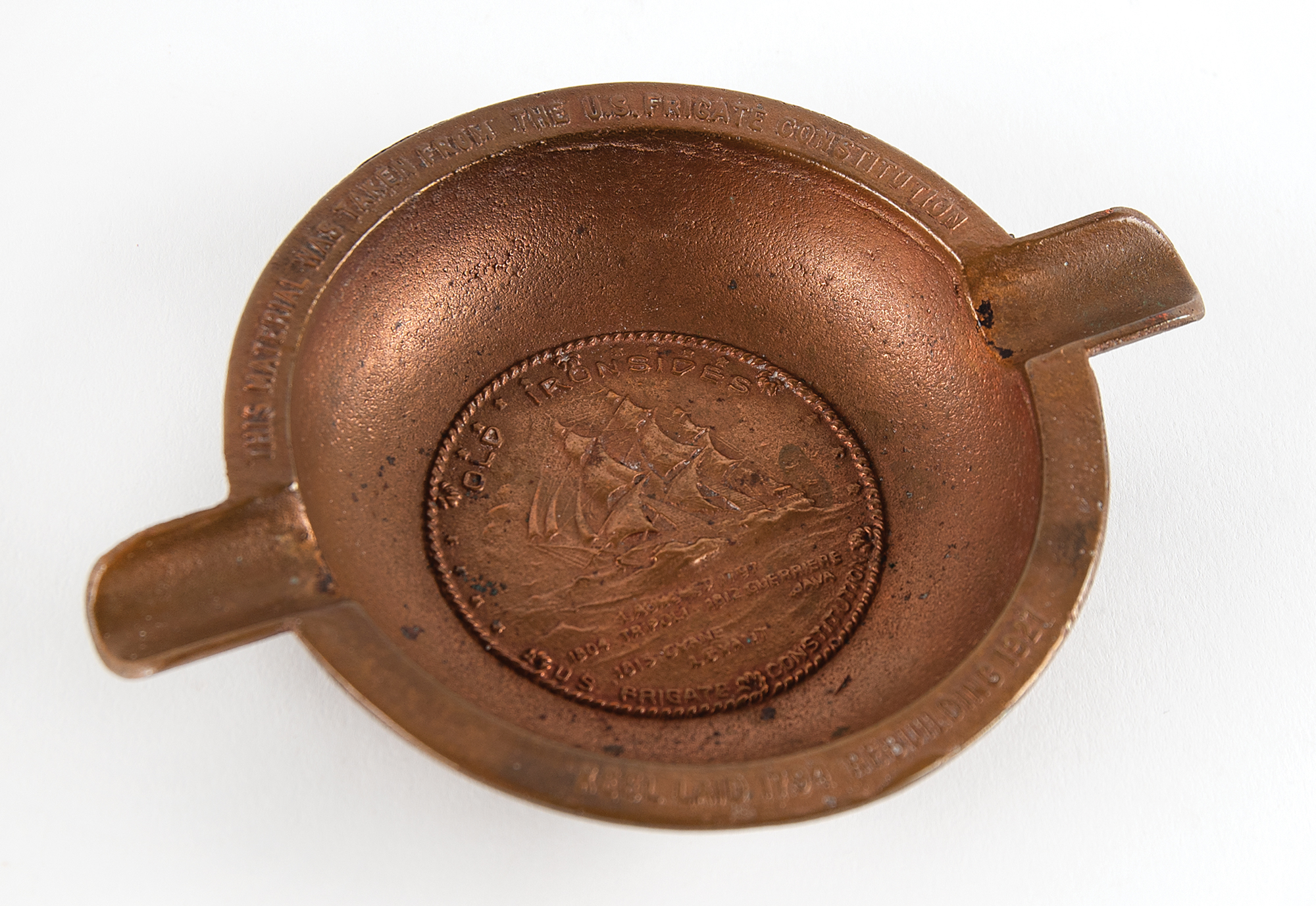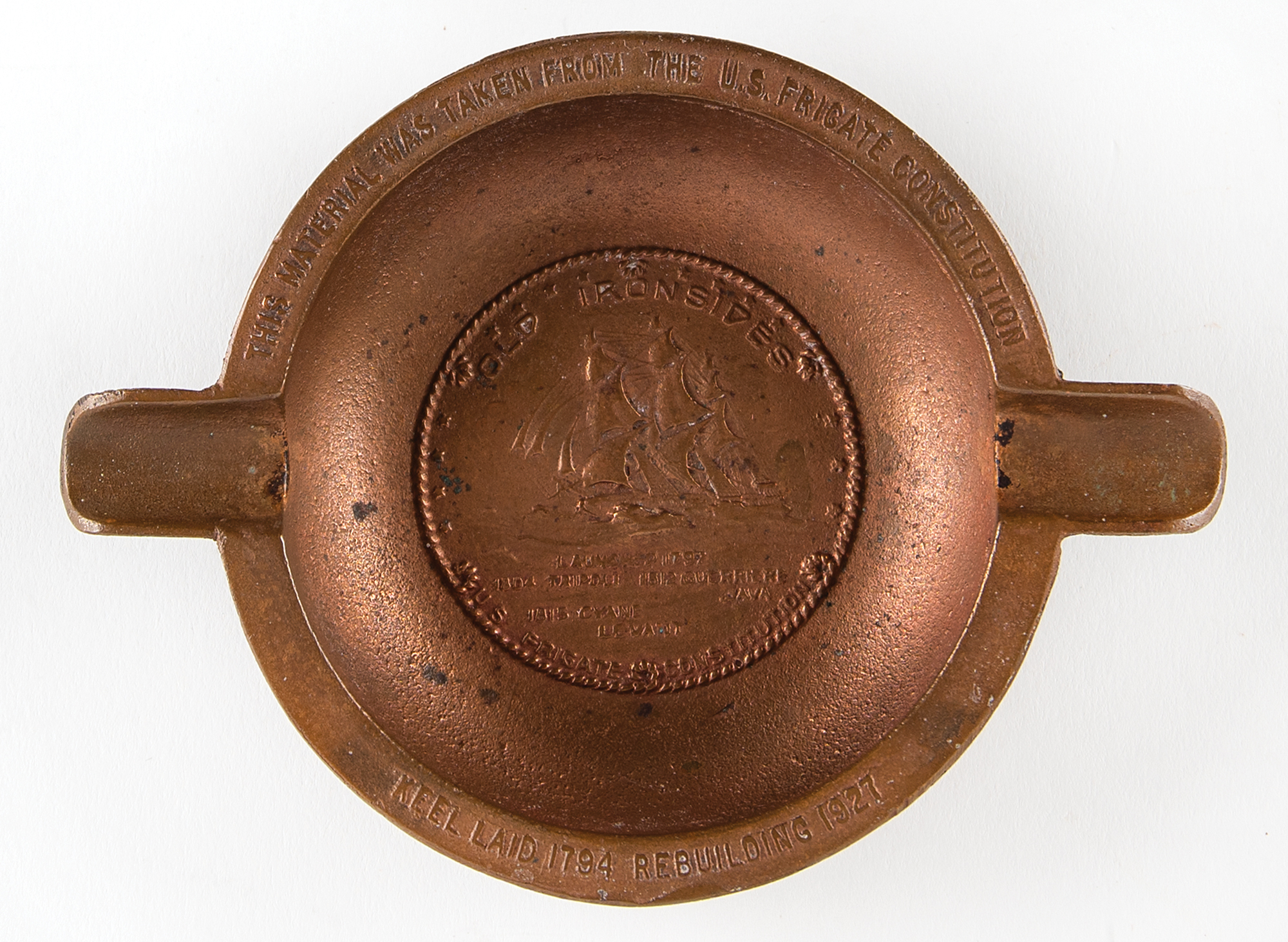 Foundry cast bronze ashtray made from metal reclaimed during the 1927 restoration of the USS Constitution. The ashtray measures 6.25˝ x 4.5˝ x 1˝, with bowl featuring an embossed design of the three-masted heavy frigate, with raised text: "Old Ironsides, Launched 1797, 1804 Tripoli, 1812 Guerriere Java, 1815 Cyane Levant, U.S. Frigate Constitution." The ashtray rim bears two holders and text: "This material was taken from the U.S. Frigate Constitution, Keel laid 1794, rebuilding 1927." In fine condition.